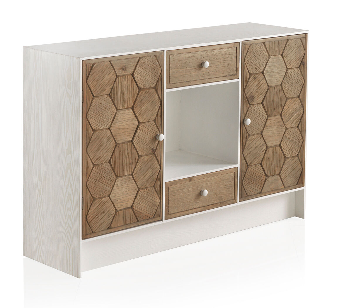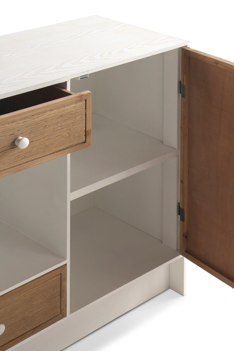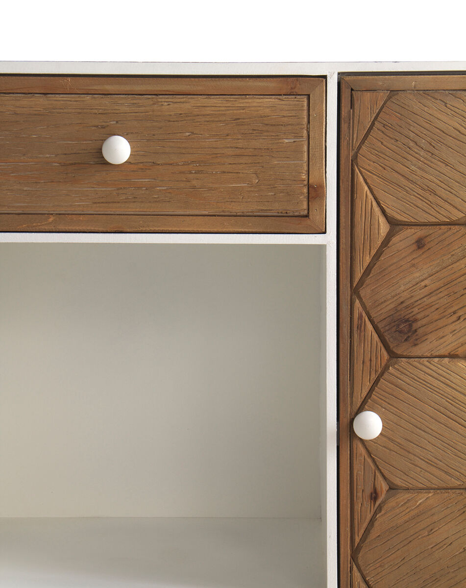 A parte frontal das portas e gavetas é em madeira de abeto com gravação em favo de mel e o interior com uma prateleira torna a capacidade de arrumação ideal. As laterais e a parte superior são em branco lavado.