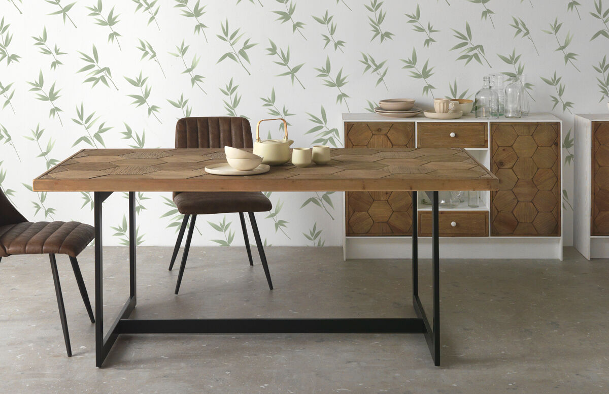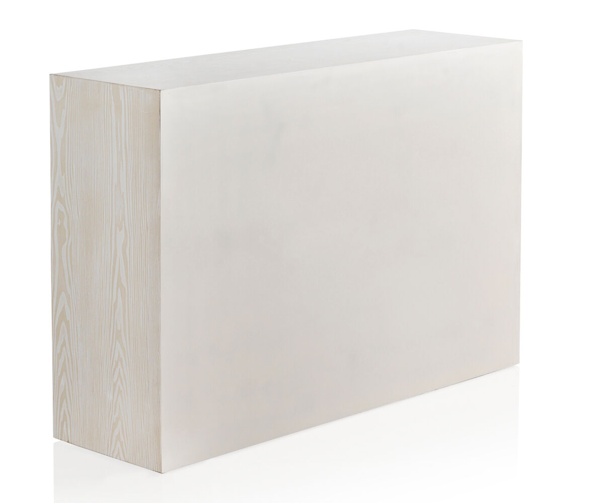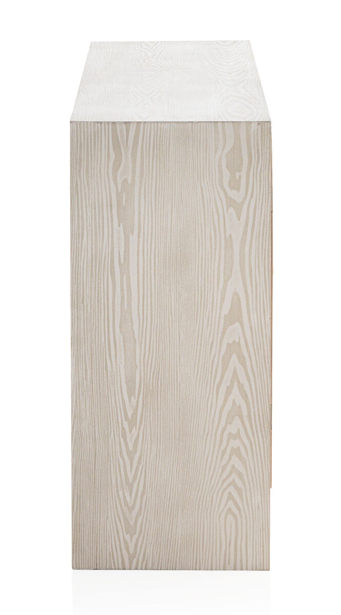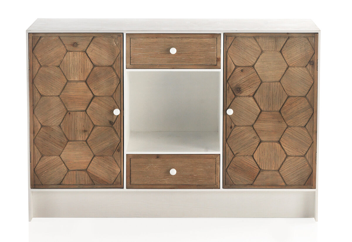 A parte frontal das portas e gavetas é em madeira de abeto com gravação em favo de mel e o interior com uma prateleira torna a capacidade de arrumação ideal. As laterais e a parte superior são em branco lavado.