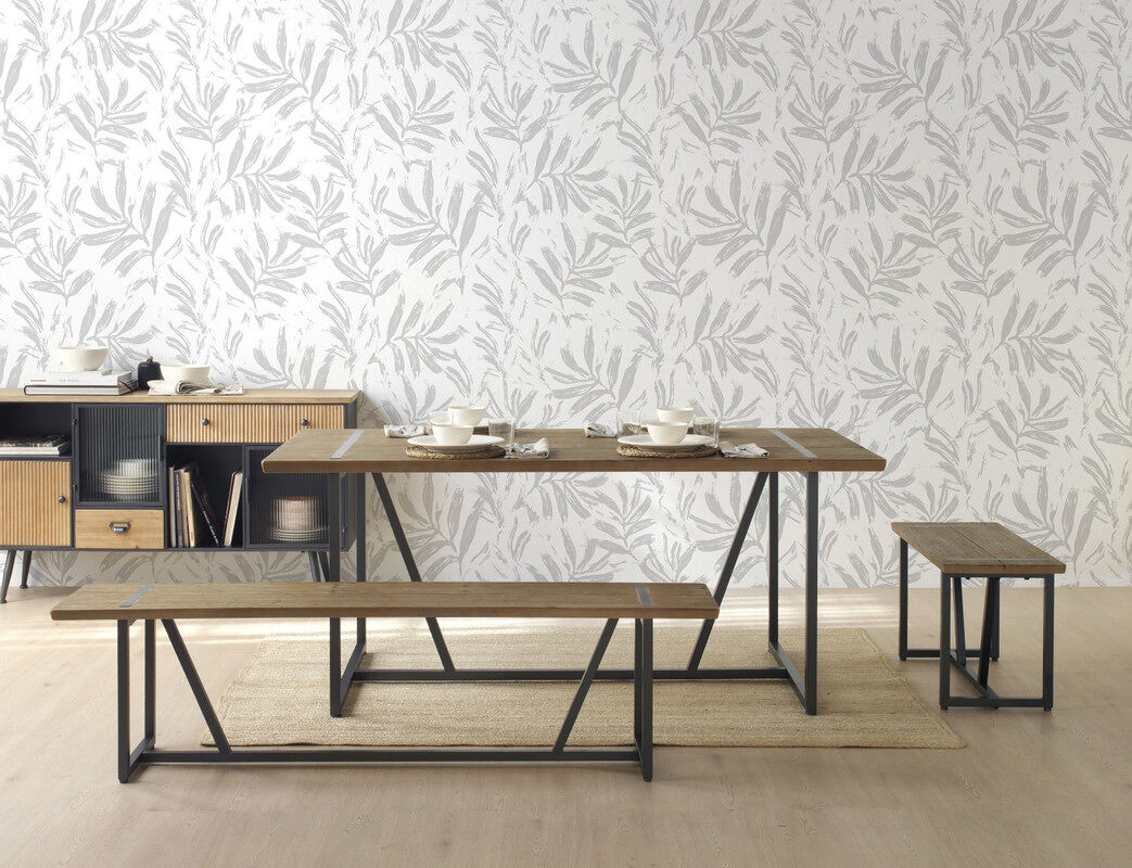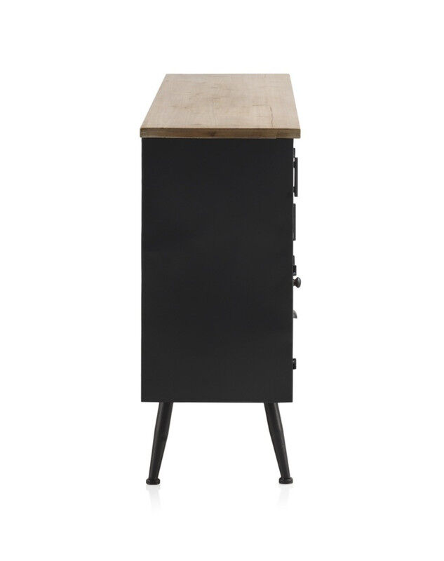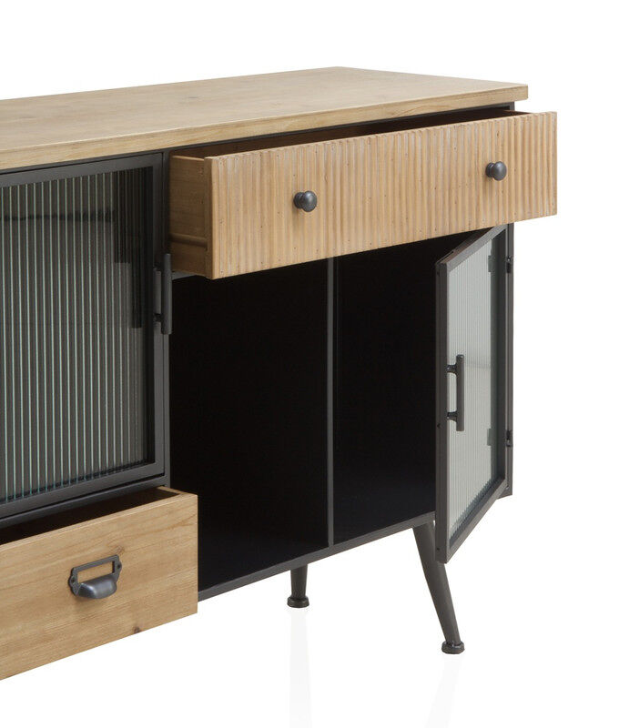O aparador metálico com tampo de madeira possui uma tábua superior com 2 cm de espessura. Suas portas são feitas de vidro canelado semi-opaco e não possuem prateleira interior. A medida da abertura superior esquerda é de 37,5x32x20 cm, enquanto a abertura inferior tem tamanho de 29x32x39 cm. A porta inferior é feita de madeira ondulada e também não possui prateleira interior. As gavetas possuem corrediças de madeira e os pés têm altura de 20,5 cm. A montagem do aparador requer apenas a colocação simples das pernas.