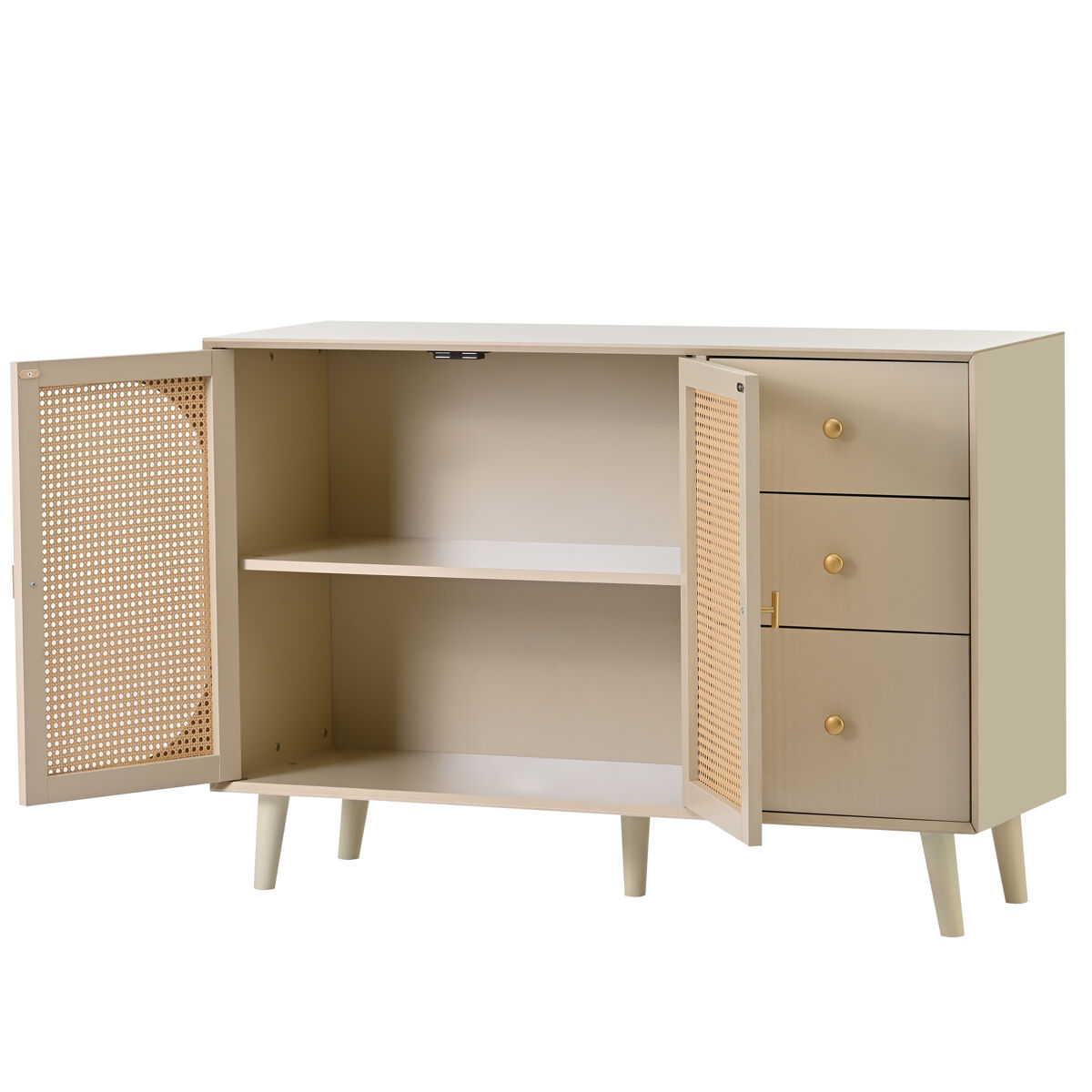 MAIS ESPAÇO DE ARMAZENAMENTO: O aparador tem 2 portas de madeira e 3 gavetas. Assim, o espaço de arrumação fica coberto!