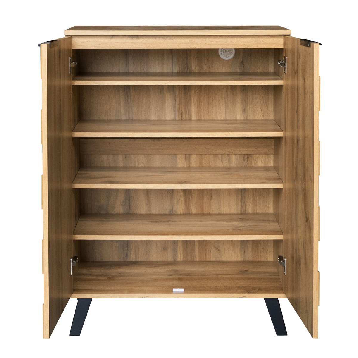 DESIGN ELEGANTE: A estrutura geométrica das portas com efeito madeira, combinada com puxadores e pés pretos, acrescenta um toque moderno a qualquer divisão.
