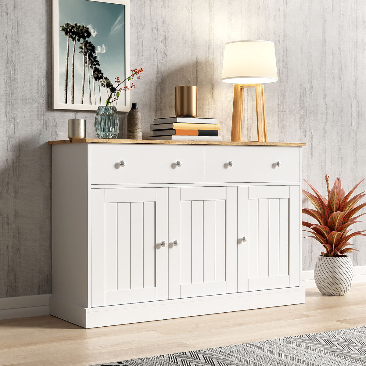 Design Elegante: O aparador combina madeira e branco, criando um visual elegante que complementa vários estilos de interiores.
