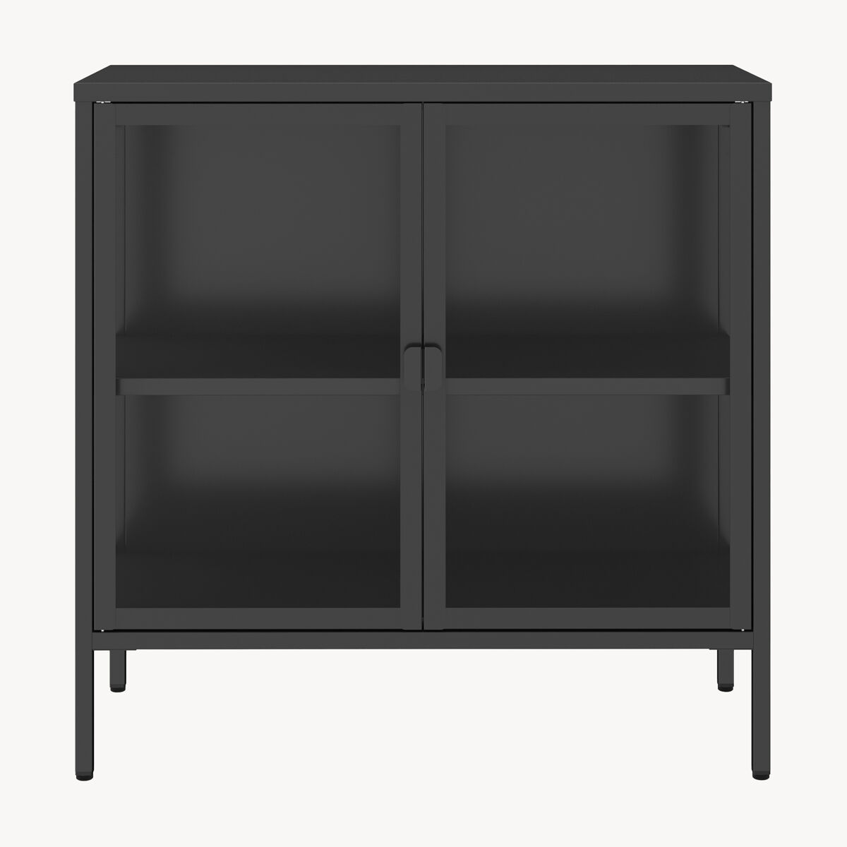 - Duas portas de armário com frente de vidro transparente e puxadores práticos