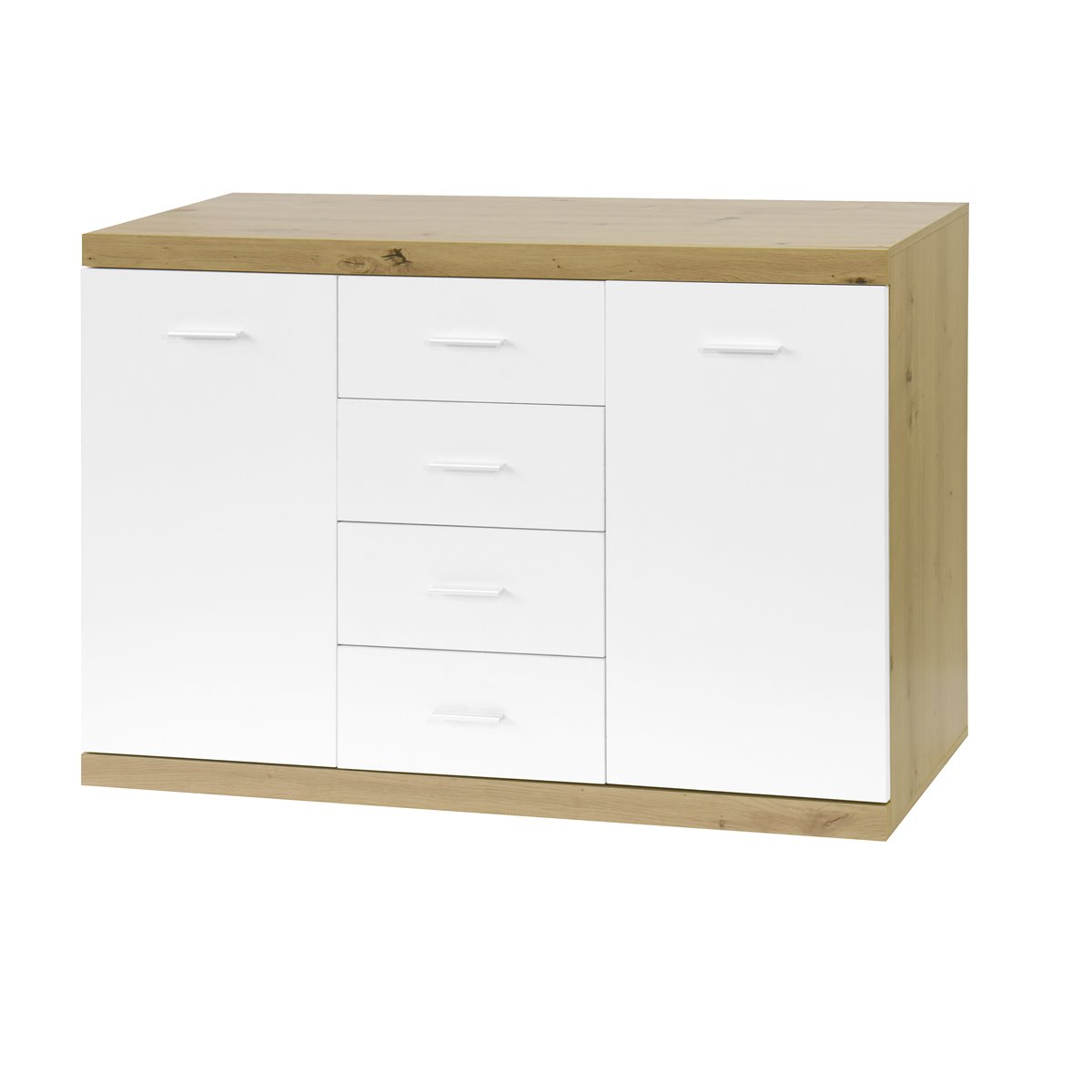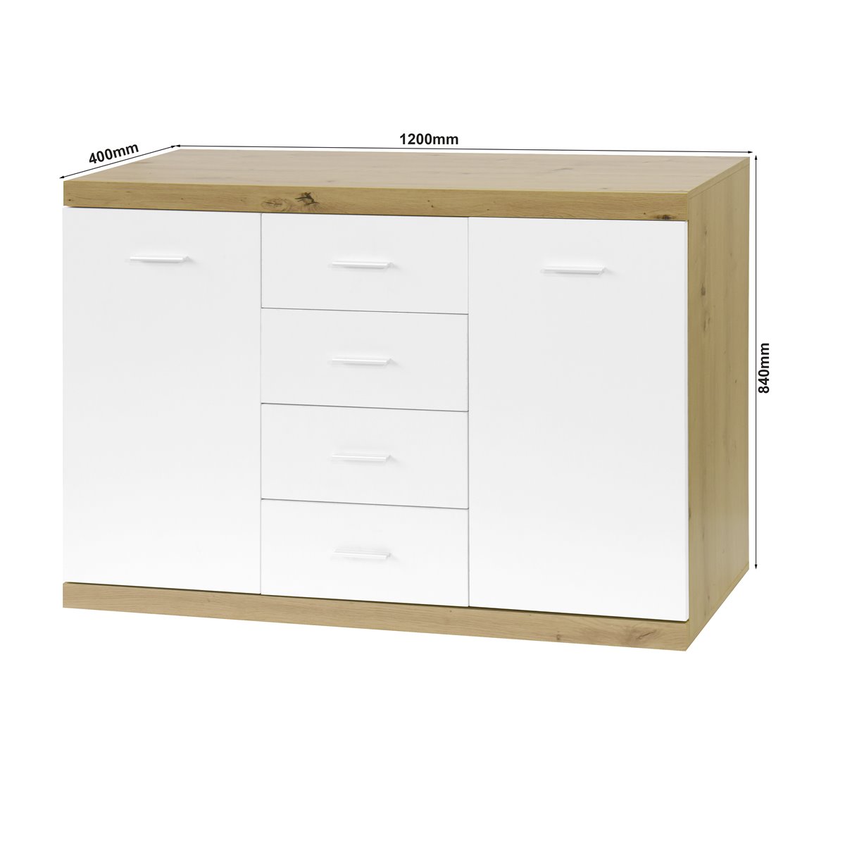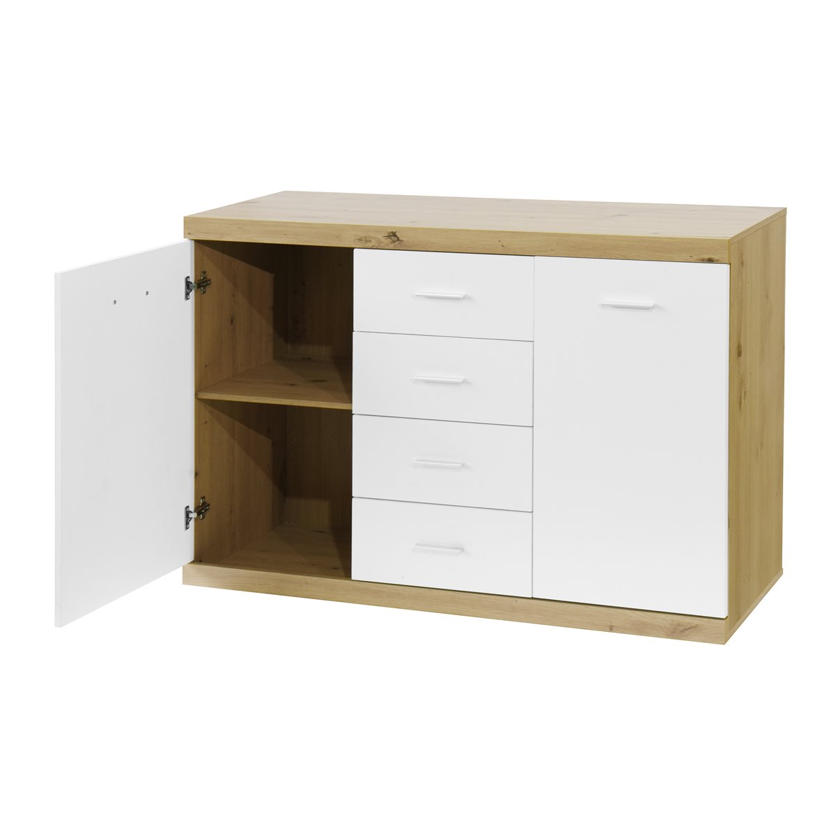 Apresentamos o elegante aparador ERVA, com 4 gavetas e 2 portas, num sofisticado acabamento branco e carvalho. O seu design contemporâneo combina funcionalidade e estilo, oferecendo um amplo espaço de arrumação para manter a sua casa bem-organizada. Ideal para qualquer divisão, este móvel não é apenas prático: é também um elemento decorativo que realça a estética do seu espaço. Ideal para guardar loiças, toalhas de mesa ou documentos, mantendo tudo acessível mas fora de vista.