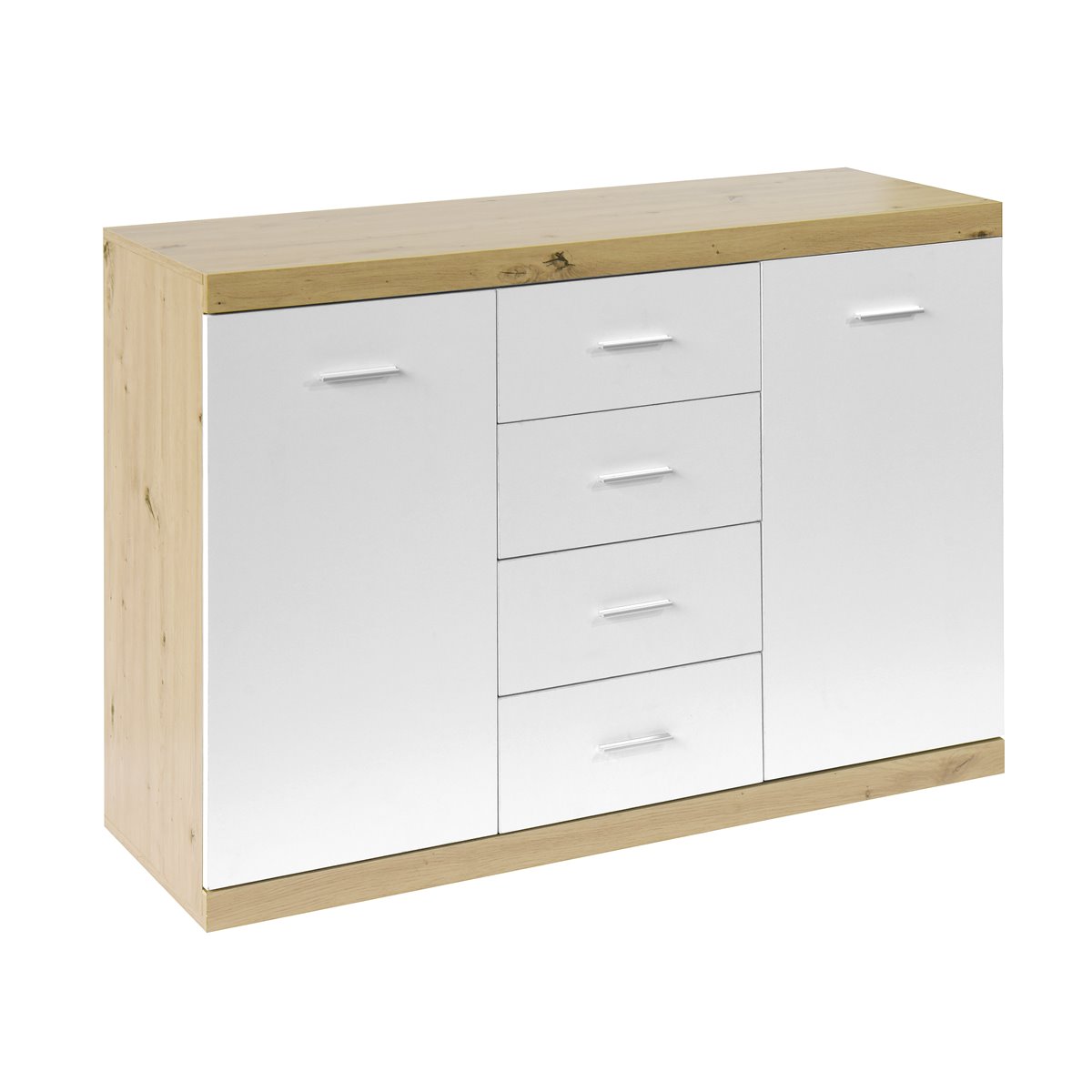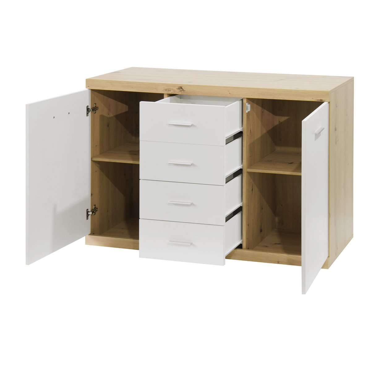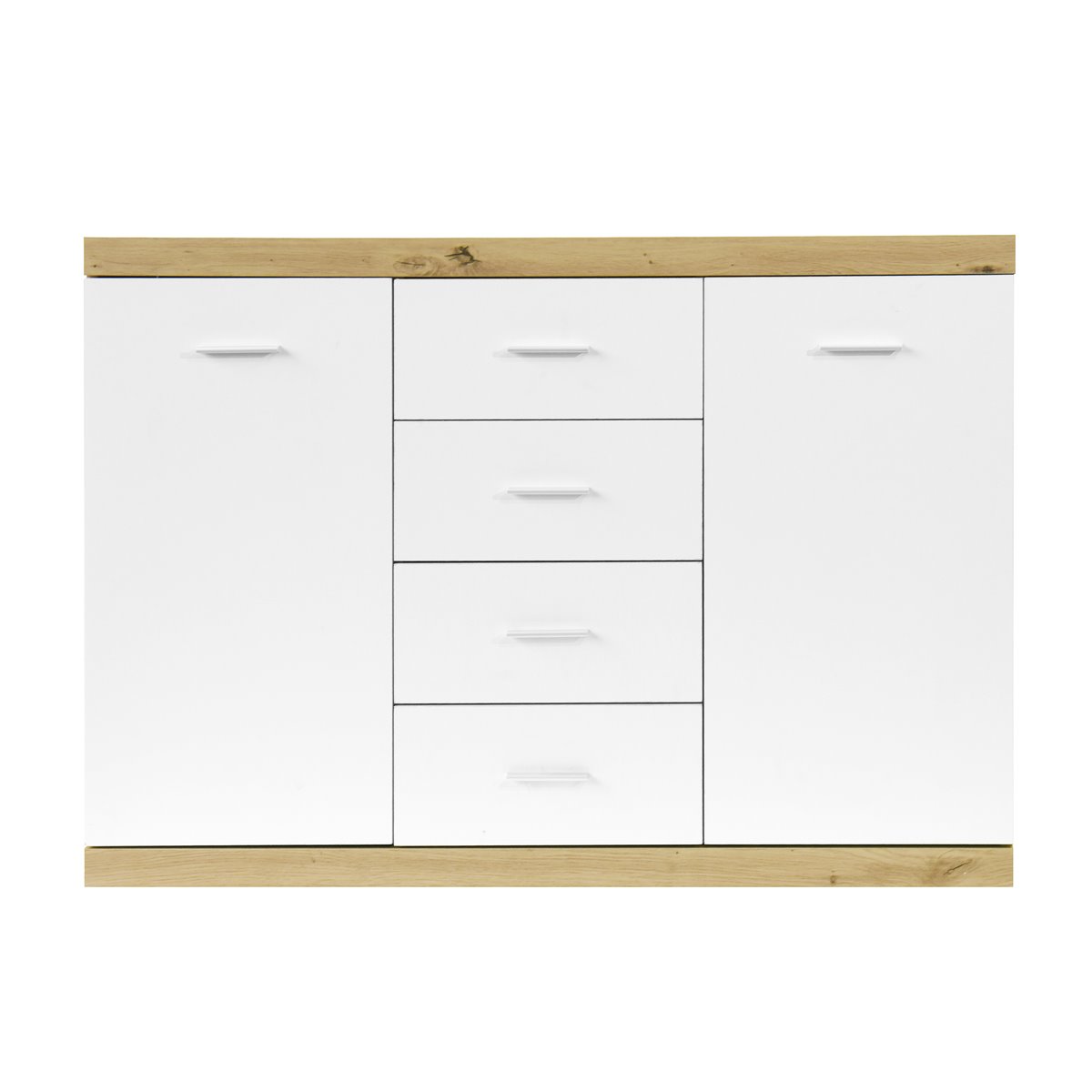 Apresentamos o elegante aparador ERVA, com 4 gavetas e 2 portas, num sofisticado acabamento branco e carvalho. O seu design contemporâneo combina funcionalidade e estilo, oferecendo um amplo espaço de arrumação para manter a sua casa bem-organizada. Ideal para qualquer divisão, este móvel não é apenas prático: é também um elemento decorativo que realça a estética do seu espaço. Ideal para guardar loiças, toalhas de mesa ou documentos, mantendo tudo acessível mas fora de vista.