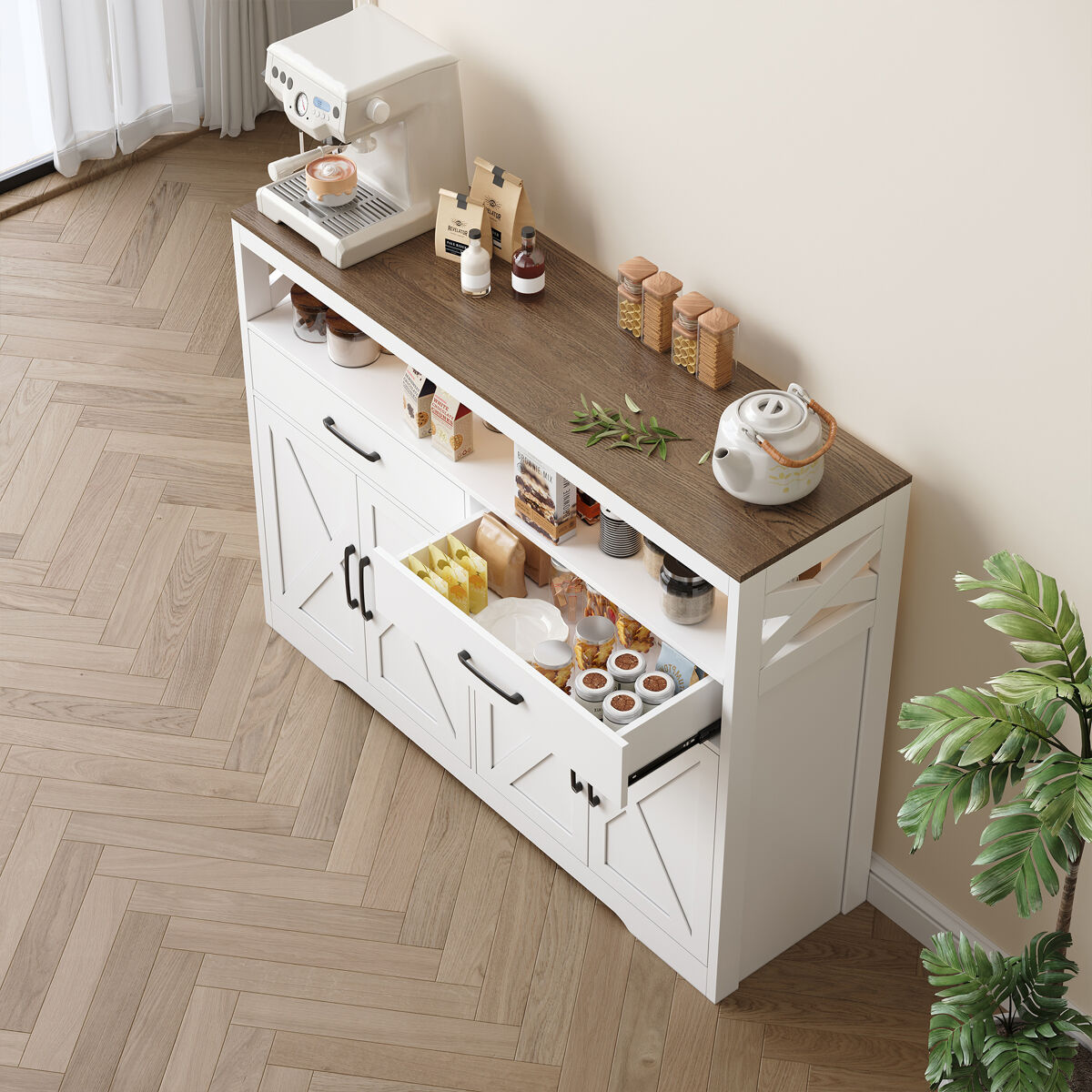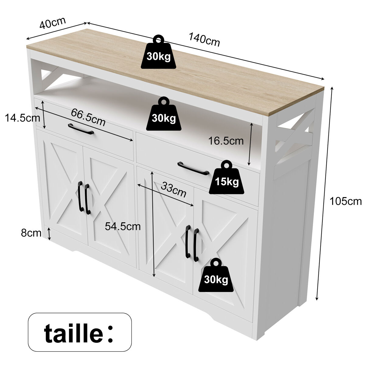 Este aparador de estilo escandinavo combina design minimalista com funcionalidade prática, sendo a escolha perfeita para a sua sala de estar, sala de jantar ou entrada. A sua estrutura em branco com tampo em madeira natural cria um ambiente acolhedor e moderno, fácil de integrar em qualquer decoração.