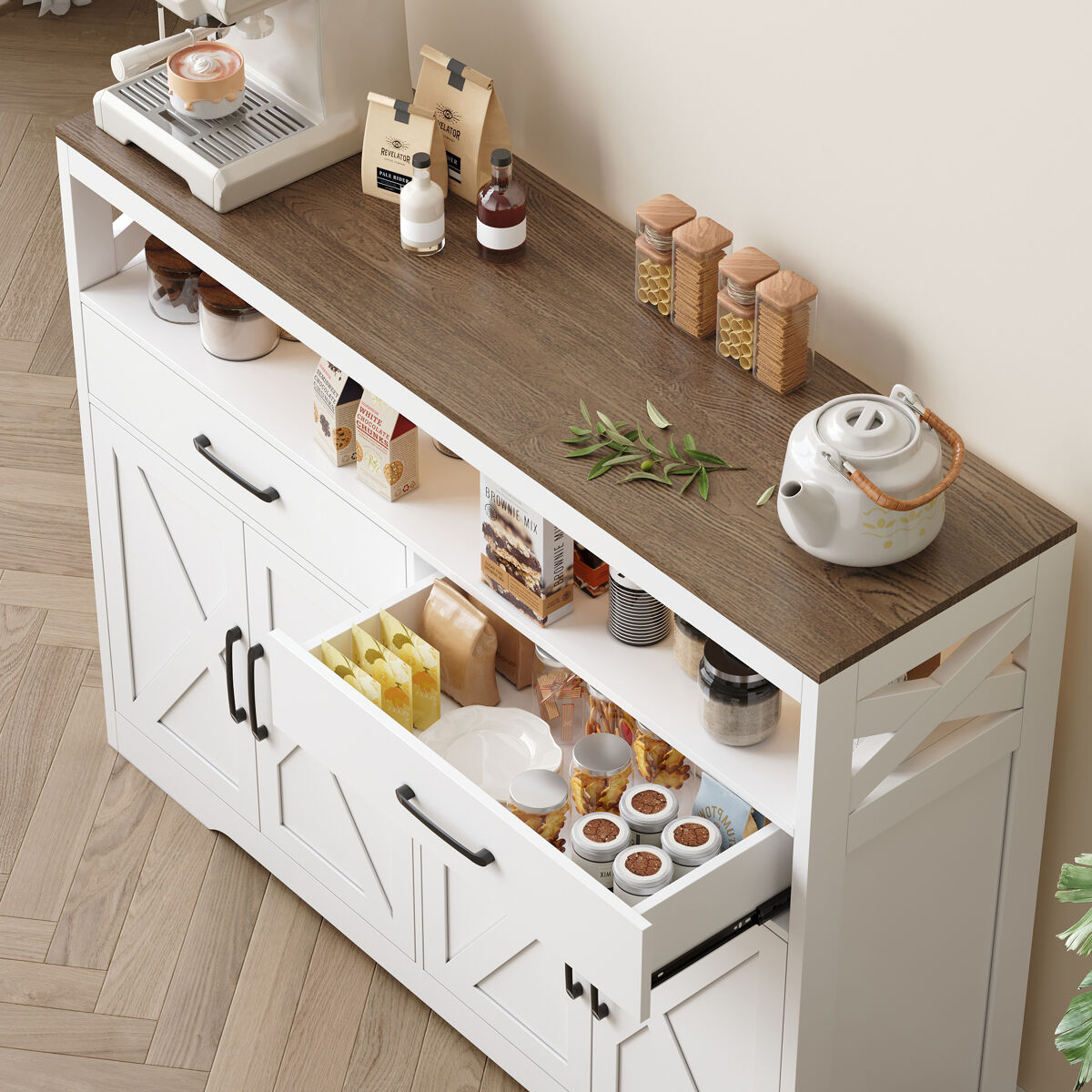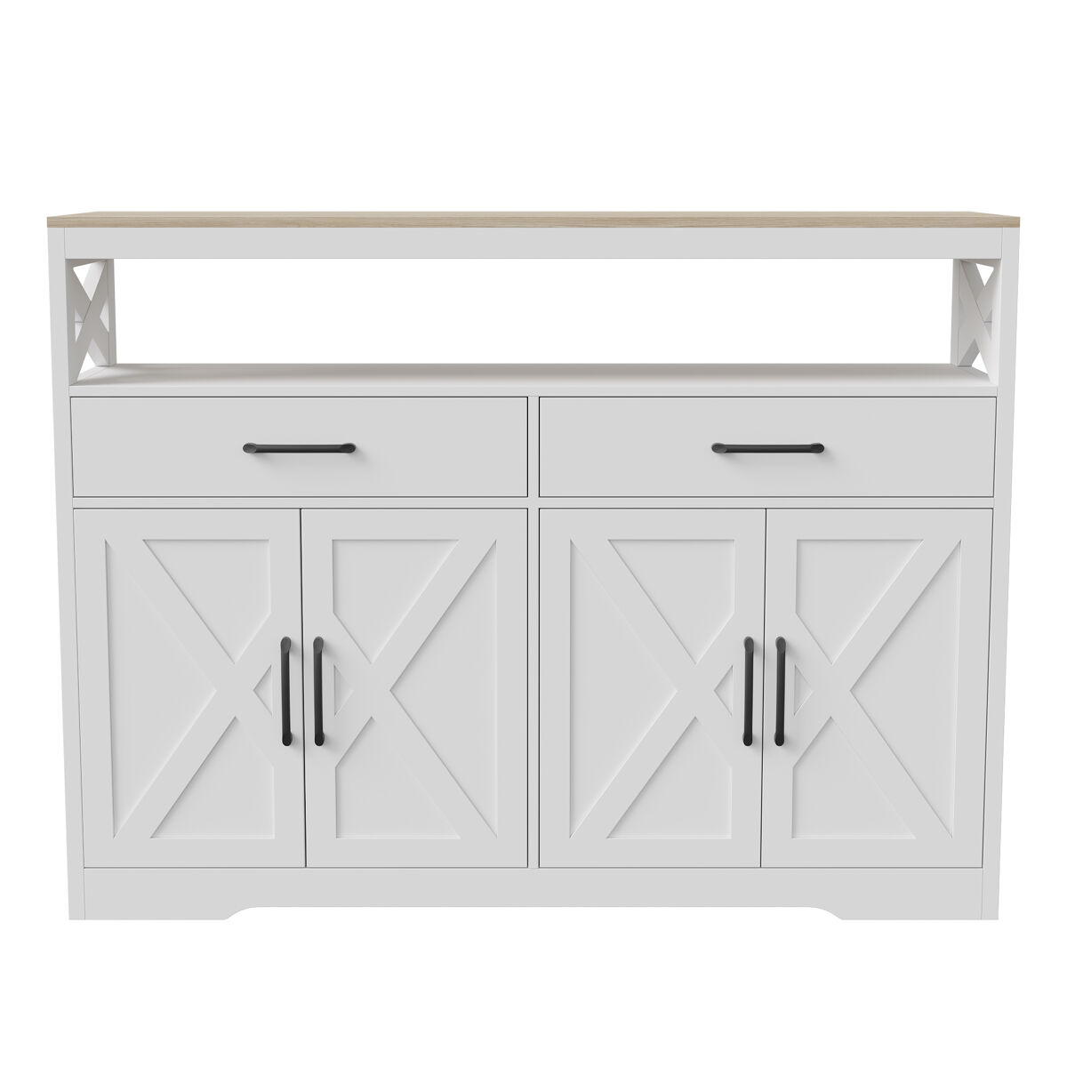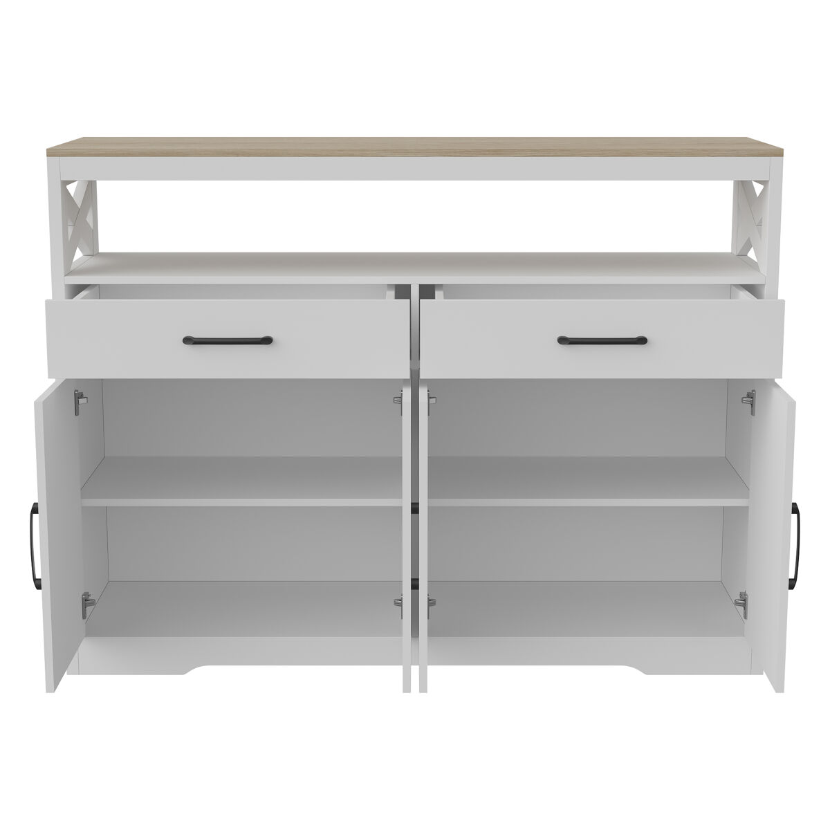 Grande Capacidade de Arrumação: Inclui 2 gavetas espaçosas, 2 portas com prateleiras ajustáveis e um nicho aberto, ideal para organizar loiças, utensílios de cozinha, pequenos eletrodomésticos ou objetos decorativos.