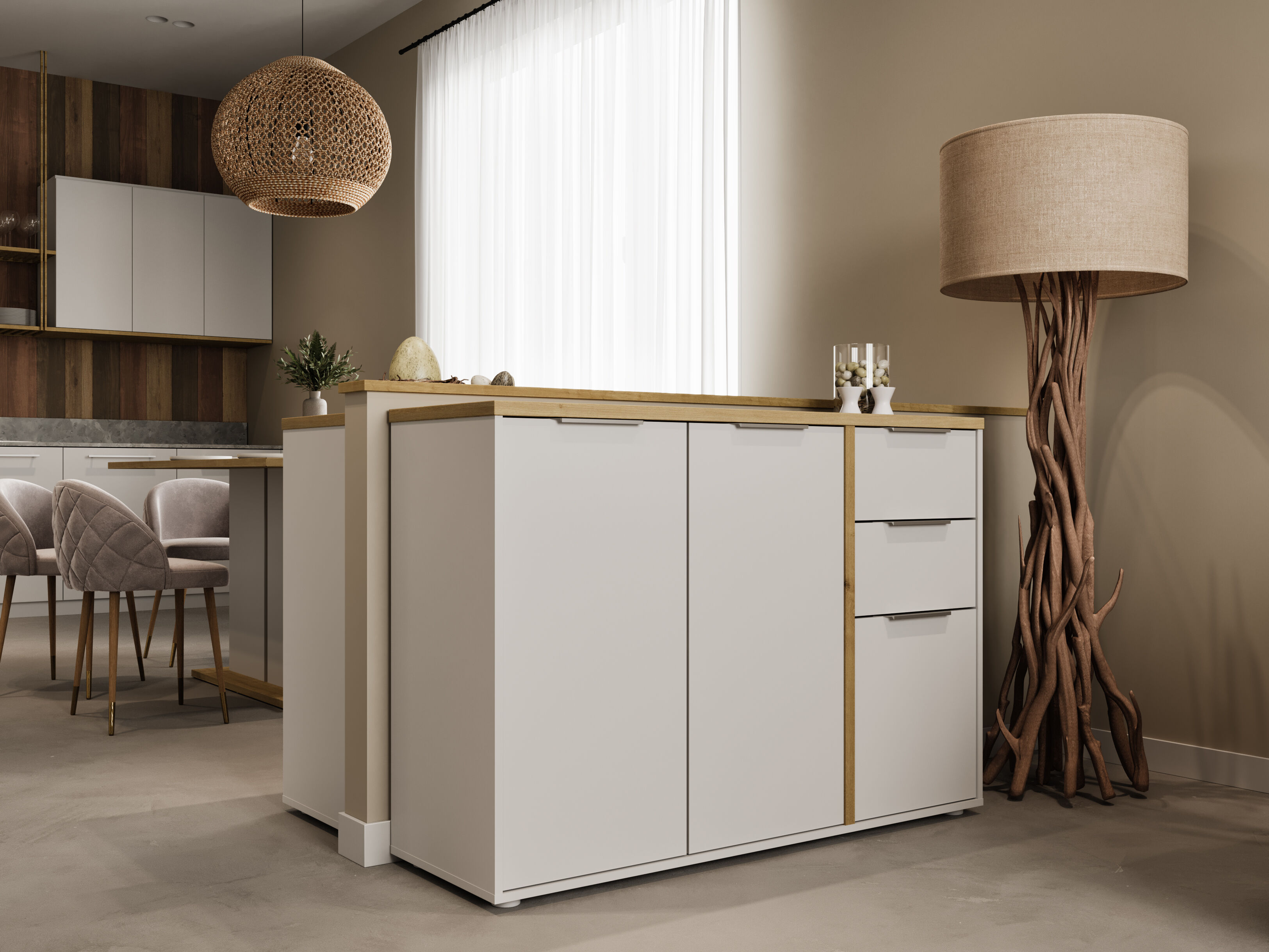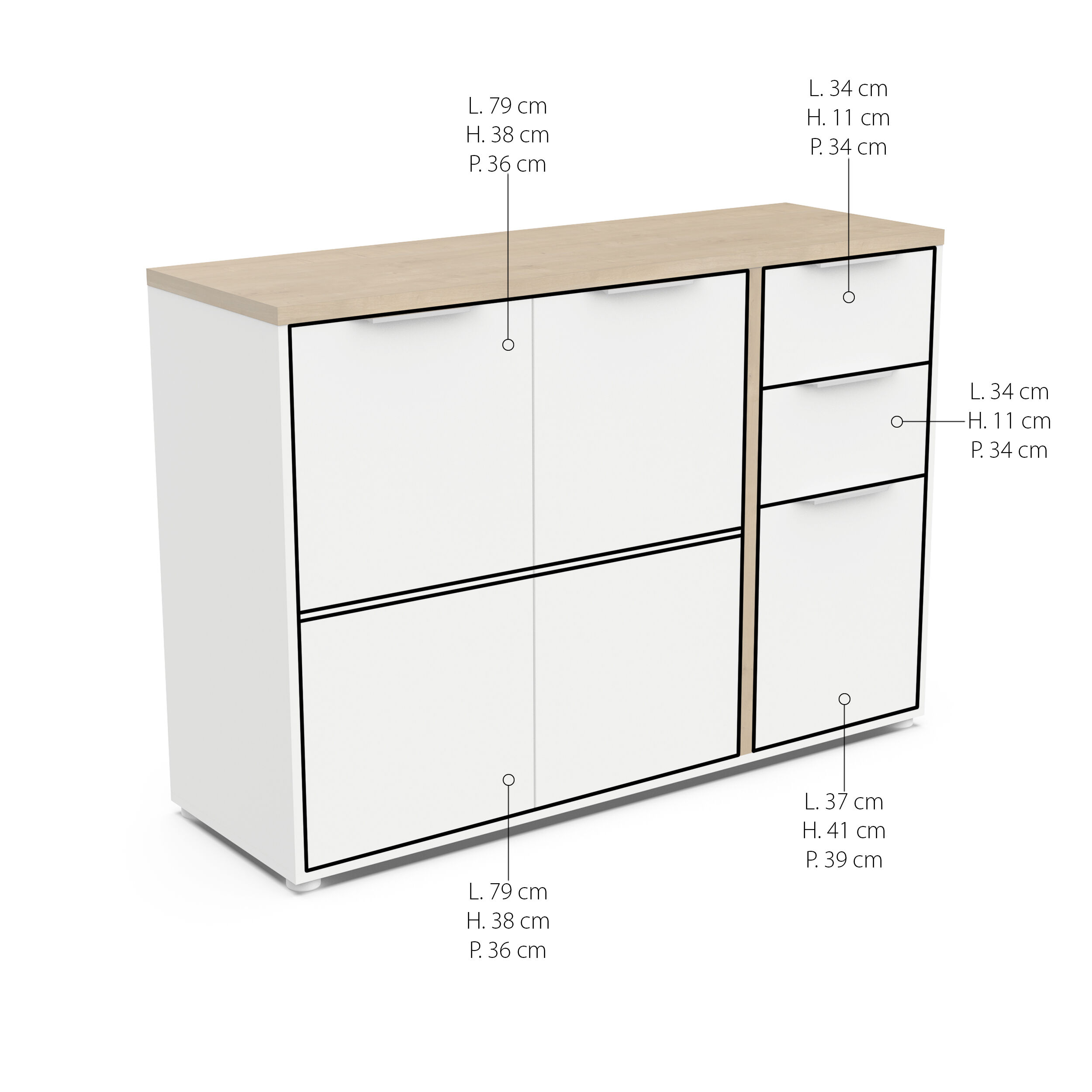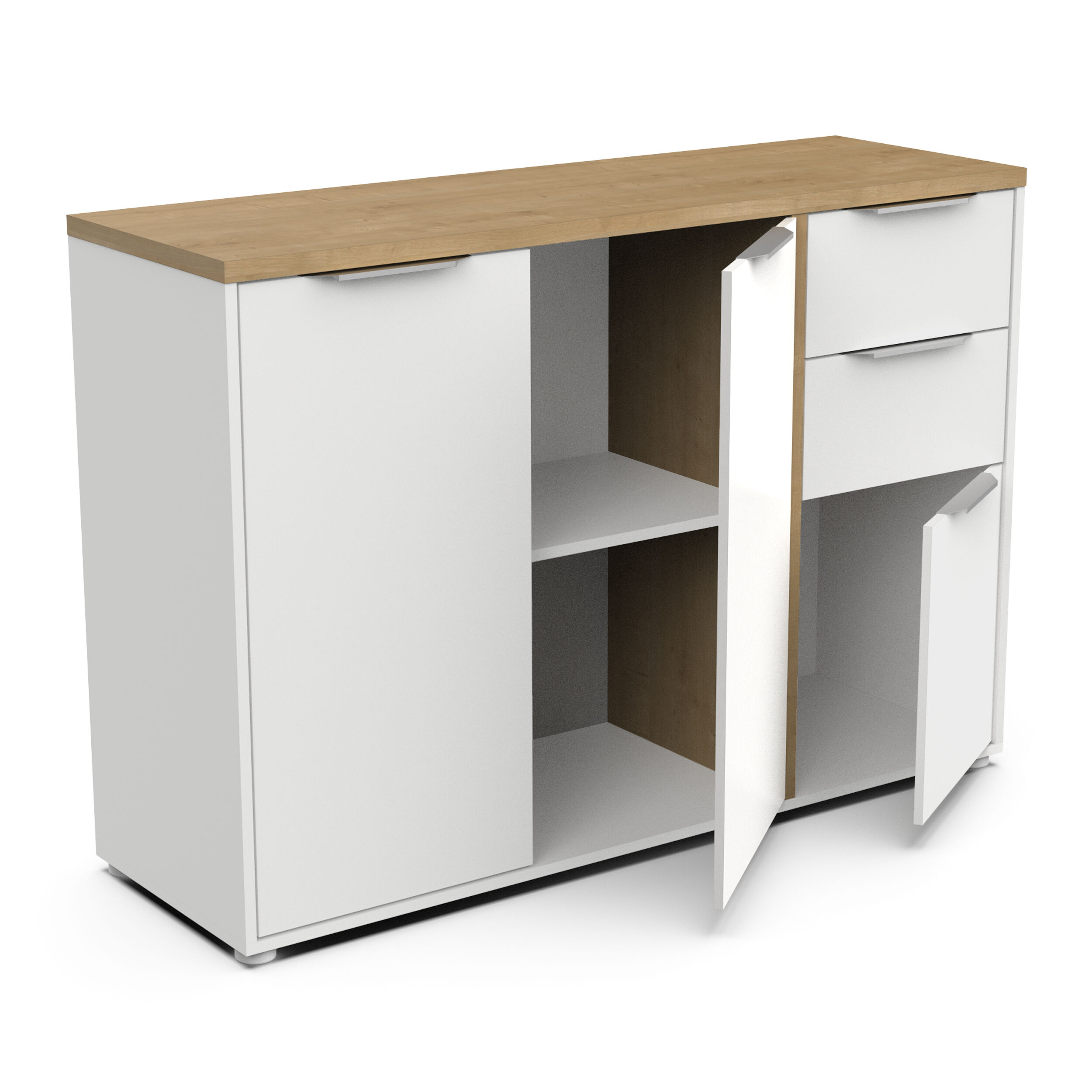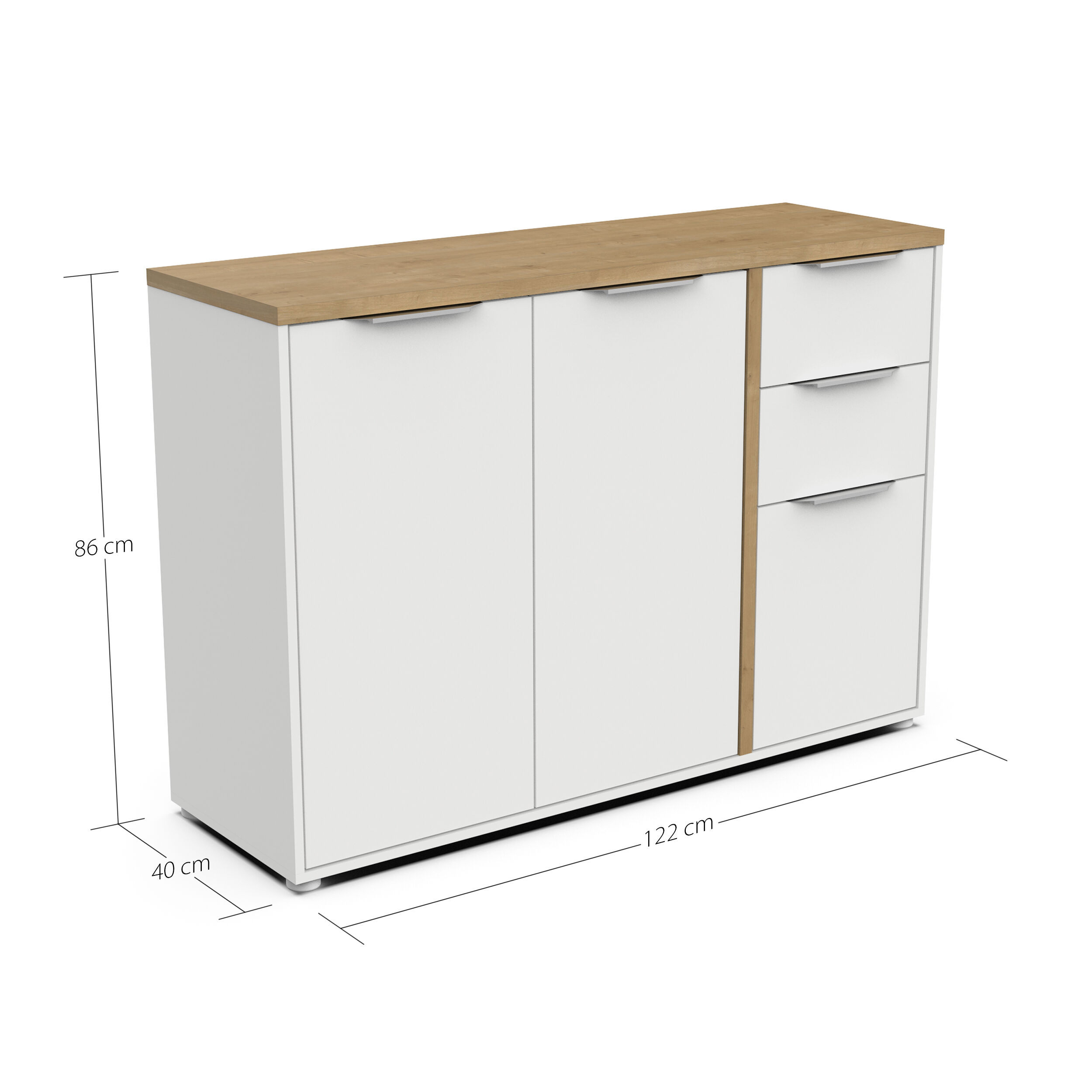 O aparador GILLES é a combinação perfeita de estilo e funcionalidade. Oferece um amplo espaço de arrumação: três portas e duas gavetas. O seu design branco com tampo em carvalho confere elegância a qualquer divisão. Fabricado com uma estrutura em MDF de 15 e 25 mm de espessura, garante resistência e durabilidade. Mede 121,5 cm de largura x 85,6 cm de altura x 39,6 cm de profundidade, ideal para organizar com estilo. Uma peça de mobiliário essencial!