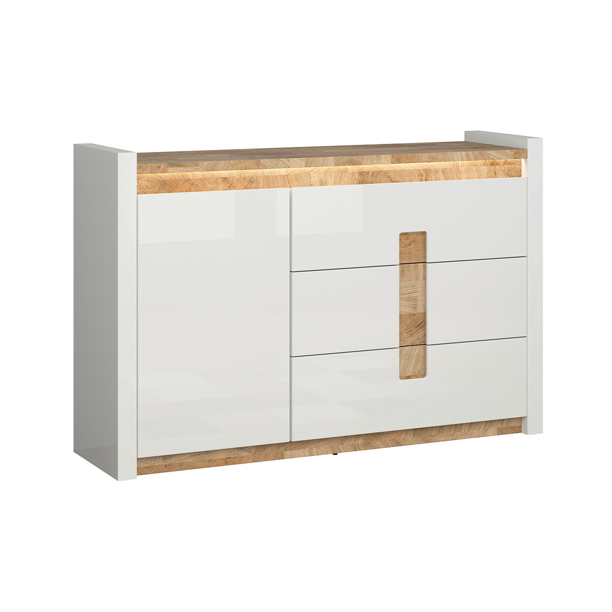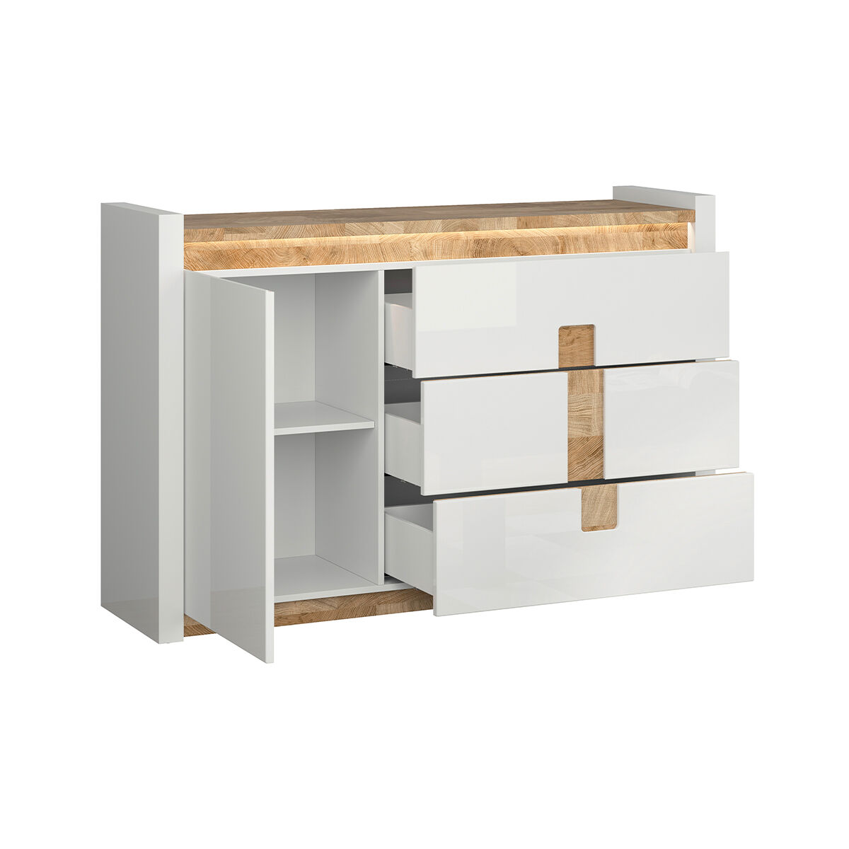 Aparador Helios de 1 porta e 3 gavetas com LED, lacado a branco e madeira