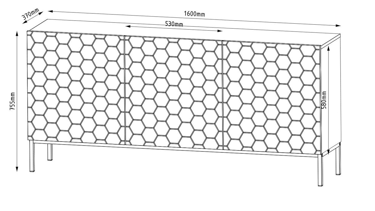 O aparador HEXA dá um toque de modernidade à coleção HEXA. Com dimensões de 76x160x37 cm, este aparador preto oferece seis prateleiras para arrumação, todas escondidas atrás de três portas com dobradiças. A sua qualidade de construção robusta garante longevidade, enquanto o estilo moderno se enquadra perfeitamente em qualquer decoração urbana.