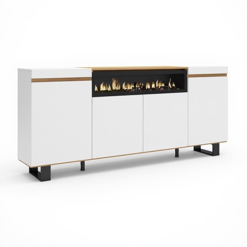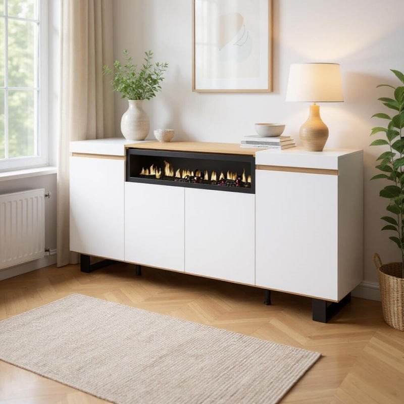 Com uma estrutura simétrica, este armário apresenta quatro portas com dobradiças que oferecem arrumação fechada e organizada para tudo, desde loiça a têxteis e objectos decorativos. No centro, uma lareira eléctrica decorativa de efeito realista torna-se o coração do design, criando um ponto focal visual único que não requer uma instalação complexa.