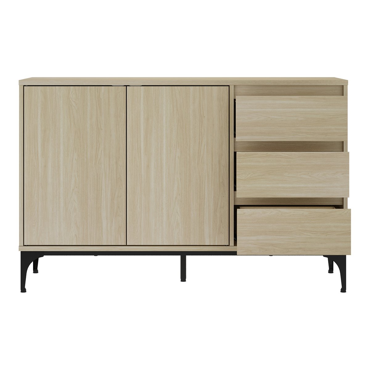 El aparador bajo KISTIANDI combina diseño moderno y funcionalidad en un solo mueble. Con dos puertas y tres cajones, es perfecto para mantener el orden en tu salón, comedor o recibidor.