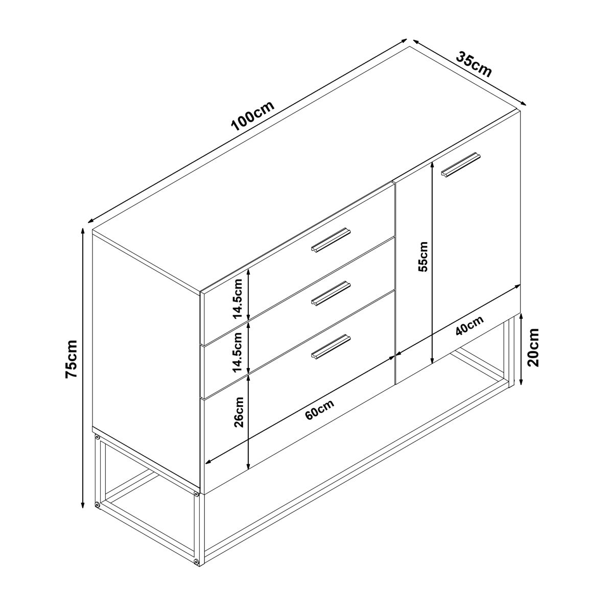 O aparador com uma porta de armário, três gavetas e uma prateleira no interior do armário é uma solução prática e elegante para as suas necessidades de arrumação. Com o seu design funcional e acabamento de alta qualidade, oferece espaço de armazenamento e apelo estético.