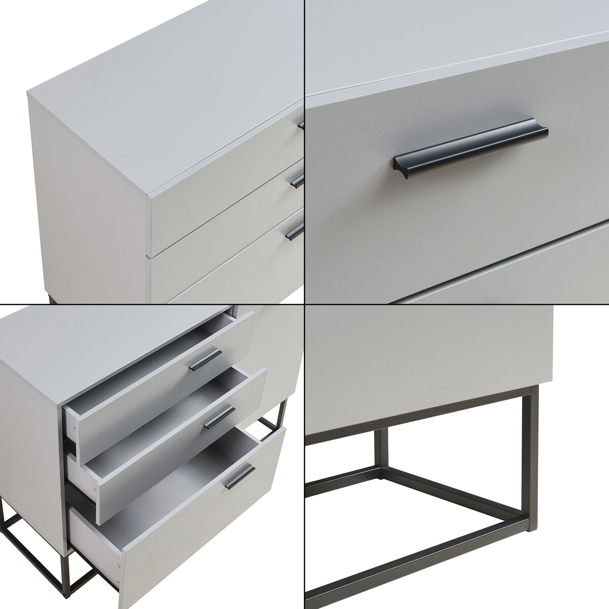 Além disso, o aparador tem duas gavetas pequenas e uma grande, que são ideais para guardar todo o tipo de objectos. Aqui pode manter talheres, guardanapos, artigos de papelaria ou outros acessórios limpos e bem organizados. As três gavetas espaçosas são fáceis de abrir e fechar, para que possa aceder convenientemente ao conteúdo a qualquer momento.O aparador impressiona com o seu design intemporal e combina com vários estilos de interiores. Utilize o espaço de arrumação generoso e as opções de arrumação versáteis para manter os seus itens organizados e de fácil acesso. Este aparador é o complemento ideal para o seu espaço de vida.
