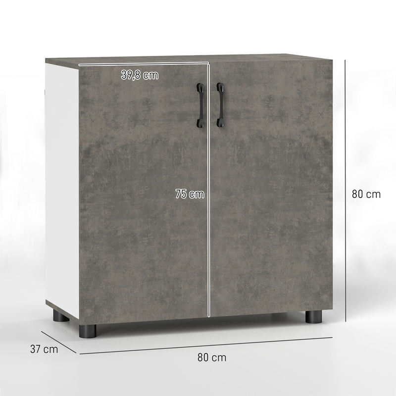 Renove o seu espaço com este aparador de dois níveis. O seu design moderno em cinza cimento e branco brilhante combina estilo e funcionalidade, tornando-o uma escolha versátil para qualquer ambiente. Com portas de fecho suave, correia anti-tombo e almofadas antiderrapantes, proporciona segurança e tranquilidade. Perfeito como aparador decorativo, buffet ou móvel de entrada, adapta-se facilmente ao seu espaço Características: - Aparador de dois níveis que otimiza o espaço e mantém a organização - Portas com fecho suave para um funcionamento silencioso e seguro - Acabamento em cinza cimento e branco brilhante para um visual moderno - Correia anti-tombo incluída para maior segurança e estabilidade - Design versátil, ideal para salas de estar, corredores ou salas de jantar - Almofadas antiderrapantes que protegem o chão contra riscos e evitam deslizamentos - Requer montagem Especificaciones: - Cor: Cinza cimento, branco brilhante - Material: Melamina de madeira, MDF - Medidas totais: 80x37x80 cm - Medidas internas do armário: 77x34x35,5/35,5 cm - Altura da base ao chão: 5 cm - Carga máxima: 25 kg (total), 10 kg (tampo superior/inferior), 5 kg (prateleira) - Referência: 838-518V00GY O pacote inclui: - ● 1 x Aparador; ● 1 x Manual de instruções.