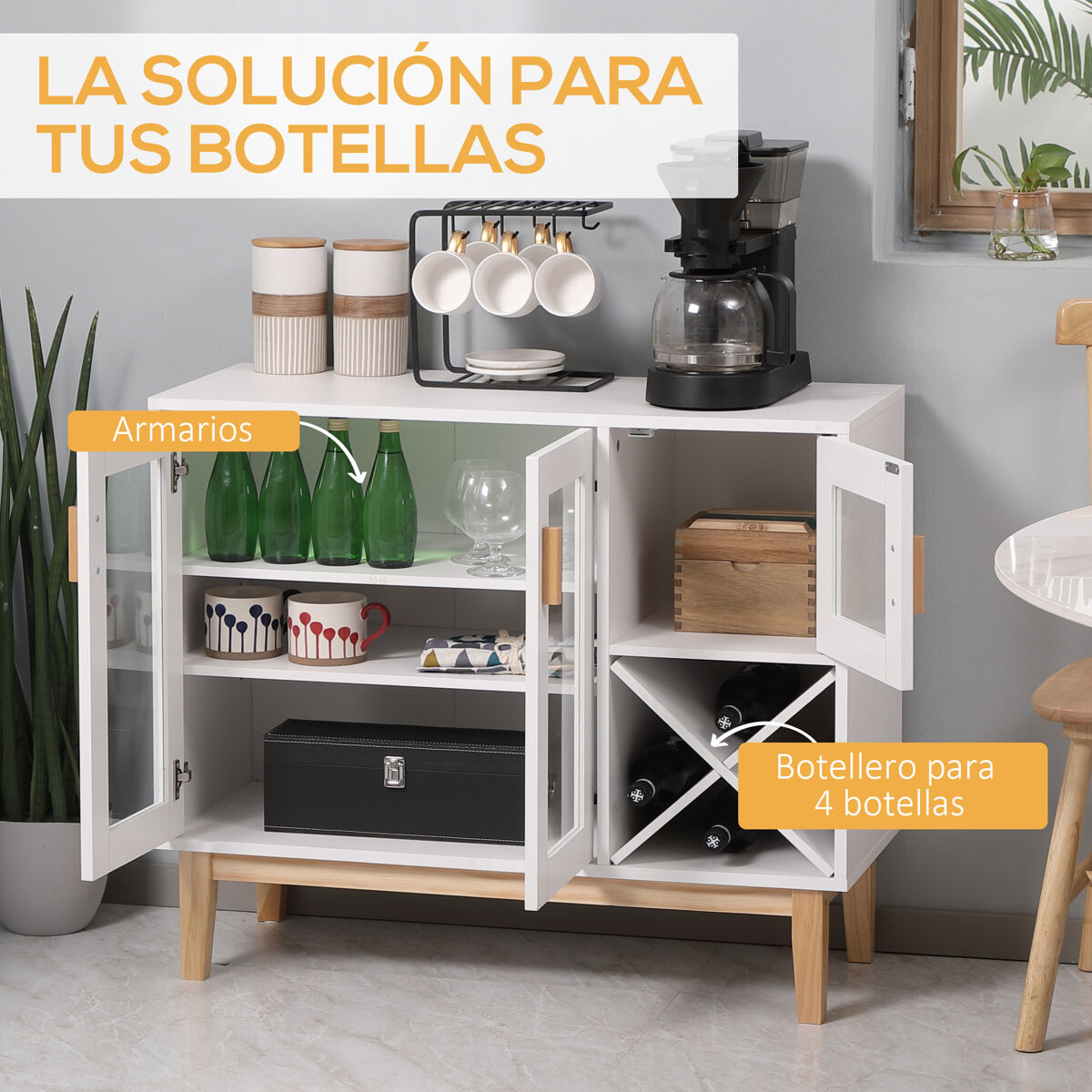 Adicione rapidamente o armazenamento necessário e obtenha espaço livre de desordem com este aparador de cozinha da HOMCOM. O estilo simples e moderno trará um toque de elegância para a sua casa e combinará facilmente com a decoração. Ao mesmo tempo, o aparador oferece amplo espaço de armazenamento com armários para seus acessórios e utensílios diários e suporte para até 4 garrafas de vinho. Além disso, conta com prateleira ajustável para se adaptar as suas diferentes necessidades de armazenamento Características: - Conta com 2 armários e um suporte para até 4 garrafas de vinho - As portas de vidro emolduradas trazem elegância e classe para a decoração da sua casa - As prateleiras contam com altura ajustável para se adaptar as suas diferentes necessidades de armazenamento - Fabricado em melamina de madeira e pés madeira de pinho para maior robustez e facilidade de limpeza - Os pés elevados mantém a base elevada, protegendo assim seus objetos da humidade - Conta com um sistema anti-tombo para maior estabilidade e segurança - Requer montagem Especificaciones: - Cor: Branco e madeira - Material: Melamina de madeira e madeira de pinho - Medidas totais: 90x37x75cm (CxLxA) - Medidas dos armários: 56,8x33,6x19,7/11,5/21cm (esquerda) e 28,5x35,5x27cm (direita) - Suporte para garrafas: 28,5x35,5x26,5cm - Capacidade máxima de peso: 60kg (total) e 10kg (prateleira) - Referência: 835-654 O pacote inclui: - ● 1x Aparador; ● 1x Manual de instruções