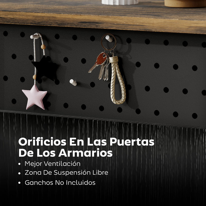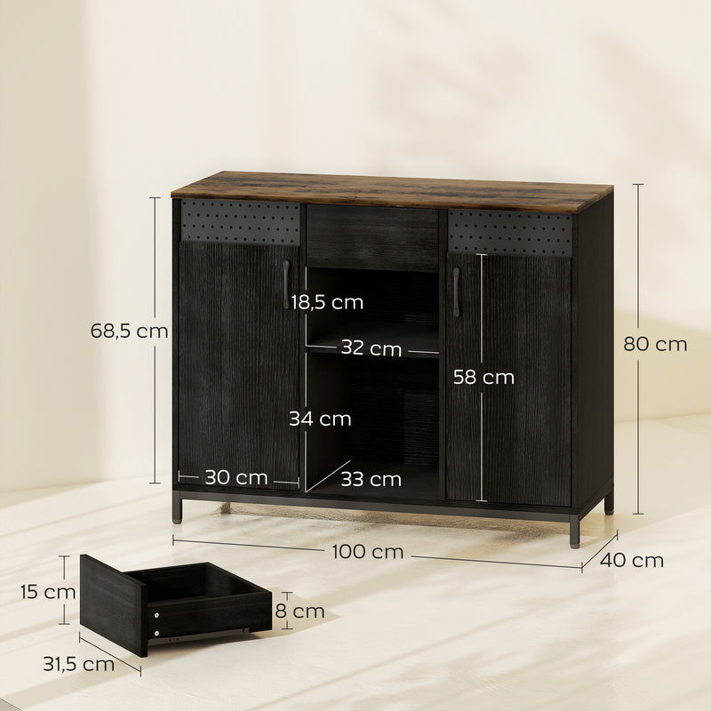 Cansado da desorganização em casa? Quando tudo está fora do lugar, a rotina torna-se caótica e a decoração perde o charme. O aparador buffet da HOMCOM ajuda a organizar o espaço com arrumação prática e versátil. O seu design moderno, com uma bonita combinação de cores, valoriza qualquer divisão, trazendo ordem, tranquilidade e um toque especial à sua cozinha ou sala Características: - Gaveta prática para talheres e pequenos utensílios - Dois armários para guardar panelas, tachos e outros objetos - Dois compartimentos abertos com prateleira regulável, para manter os itens organizados e acessíveis - Portas com orifícios que garantem ventilação e permitem colocar ganchos para arrumação suspensa - Design moderno que combina com sala de jantar, sala de estar, corredor ou escritório - Estrutura resistente em melamina de madeira e metal robusto, ideal para uso diário - Pés ajustáveis para maior estabilidade e kit anti-tombo incluído para segurança - Montagem necessária Especificaciones: - Cor: Preto e castanho rústico - Material: Melamina de madeira e metal - Medidas totais: 100x40x80 cm (CxLxA) - Medidas do compartimento aberto: 32x33x18,5 cm (CxLxA) (superior), 32x33x34 cm (CxLxA) (inferior) - Medidas internas da gaveta: 29x28,8x8 cm (CxLxA) - Medidas internas do armário: 30x35x68,5 cm (CxLxA) - Altura dos pés: 8 cm - Capacidade máxima: 40 kg (total), 20 kg (bancada), 5 kg (prateleira) - Referência: 838-577V00BK O pacote inclui: - ● 1 x Aparador; ● 1 x Manual de instruções