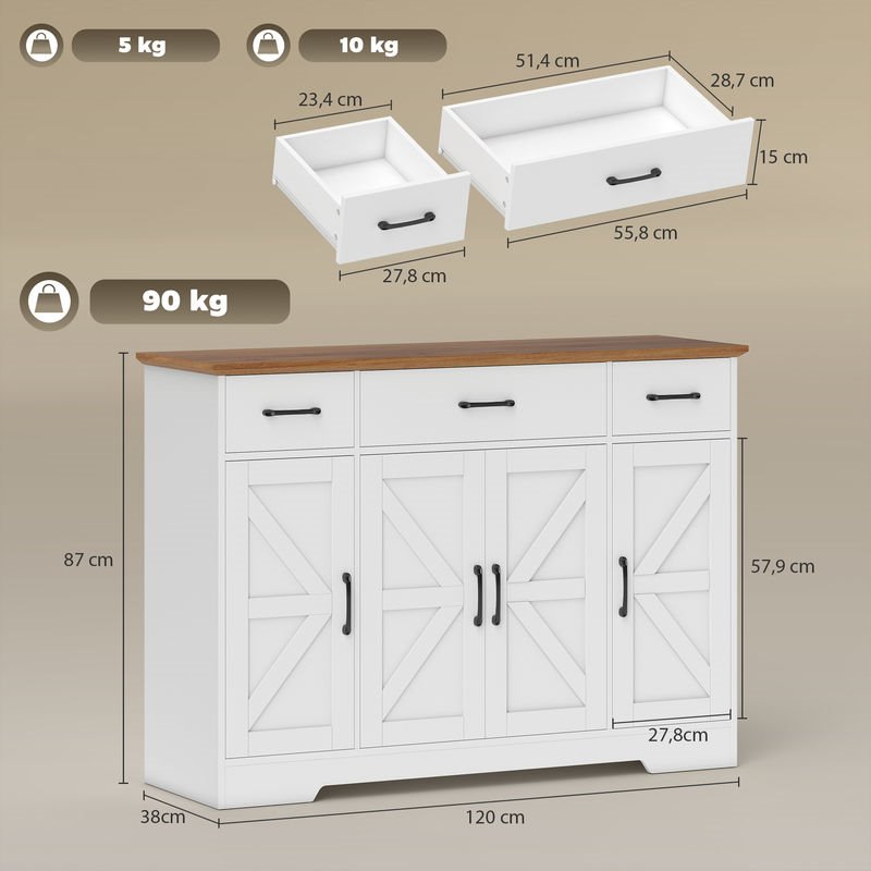 O seu espaço de jantar parece desorganizado? Este aparador da HOMCOM devolve a ordem e o estilo. Com amplas gavetas e armários, organiza desde louças até despensa. O seu design rústico com tons quentes cria um ambiente acolhedor e a sua versatilidade torna-o ideal também como móvel bar, de entrada ou para TV. Um móvel funcional que traz organização e charme à sua casa Características: - Este aparador de cozinha tem três gavetas, três compartimentos e quatro prateleiras nas portas para manter a sua cozinha organizada - As suas prateleiras internas ajustáveis em 3 alturas permitem personalizar o armazenamento conforme o tamanho dos seus objetos - O aparador adapta-se a diferentes usos: móvel de sala de jantar, móvel de TV, armário de sala ou móvel de entrada - Incorpora dobradiças de fecho suave em todas as portas, garantindo um uso silencioso e seguro - Fabricado em MDF e melamina resistente, suporta até 90 kg e oferece uma superfície fácil de limpar - Inclui dispositivo anti-tombo e pés com almofadas antiderrapantes para maior segurança e estabilidade - Requer montagem simples Especificaciones: - Cor: Branco e nogueira - Material: Melamina de madeira e MDF - Medidas totais: 120x38x87 cm (CxLxA) - Medidas internas da gaveta: 23,4x28,7x9 cm (CxLxA) (pequena), 51,4x28,7x9 cm (CxLxA) (grande) - Medidas de prateleira de porta: 17,6x9x17,6/20 cm (CxLxA) - Medidas internas do armário: 28,3x22,8x58,5 cm (CxLxA)(lateral) - Medidas internas do armário: 57,5x32,8x58,5 cm (CxLxA)(central) - Medidas de orifício de cabos: Ø5 cm - Carga máxima: 90 kg (total), 30 kg (bancada), 10 kg (gaveta/prateleira grande), 5 kg (gaveta/prateleira pequena) - Referência: 83A-362V00WT O pacote inclui: - ● 1 x Aparador; ● 1 x Manual de instruções
