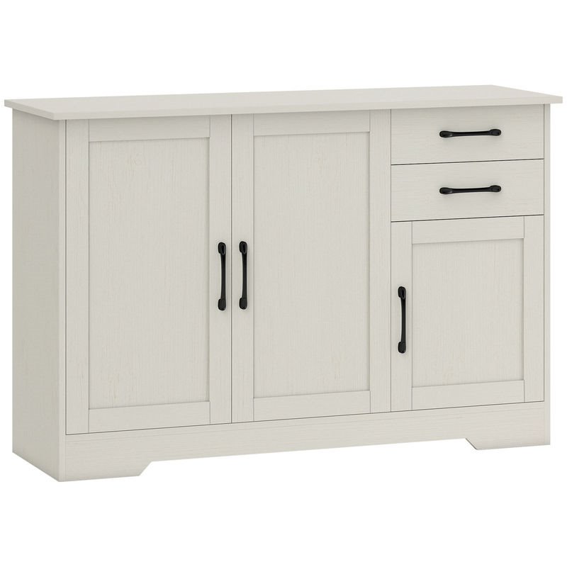 Tens a sala de jantar cheia de coisas e precisas de organização sem renunciar ao estilo? Este aparador da HOMCOM é a solução. Com dois gavetas, dois armários e uma prateleira ajustável, oferece armazenamento flexível para o que necessita. Graças ao seu design moderno e puxadores pretos, encaixa-se em salas de jantar, salas de estar ou corredores. As portas com fecho suave evitam ruídos e o seu kit anti-queda acrescenta segurança. Ideal para manter a organização com um toque decorativo. Características: - Este aparador oferece uma superfície ampla, perfeita para servir café, apoiar objetos decorativos ou preparar alimentos confortavelmente - Conta com duas gavetas ideais para organizar talheres, guardanapos ou outros acessórios pequenos de uso diário - Tem dois armários espaçosos para guardar loiça, panelas ou artigos grandes fora da vista e bem protegidos - Inclui uma prateleira ajustável no armário duplo que se adapta facilmente a objetos de diferentes alturas - Dispõe de dobradiças com fecho suave que evitam portadas e permitem um uso silencioso e confortável - O móvel aparador é versátil e adapta-se como bufete, móvel de sala de estar, móvel bar ou mesmo móvel para TV - Requer montagem Especificaciones: - Cor: Branco com efeito madeira - Material: melamina de madeira, MDF - Medidas totais: 120x38x79 cm (CxLxA) - Medidas interiores do armário: 75,5x32,5x68 cm (CxLxA) (portas duplas), 36,5x33,2x40,7 cm (CxLxA) (porta simples) - Medidas interiores da gaveta: 31,6x28,7x8 cm (CxLxA) - Carga máxima: 55 kg (total), 20 kg (tampo), 10 kg (prateleira grande), 5 kg (prateleira pequena/gaveta) - Referência: 838-587V00CW O pacote inclui: - ● 1 x Aparador; ● 1 x Manual de instruções