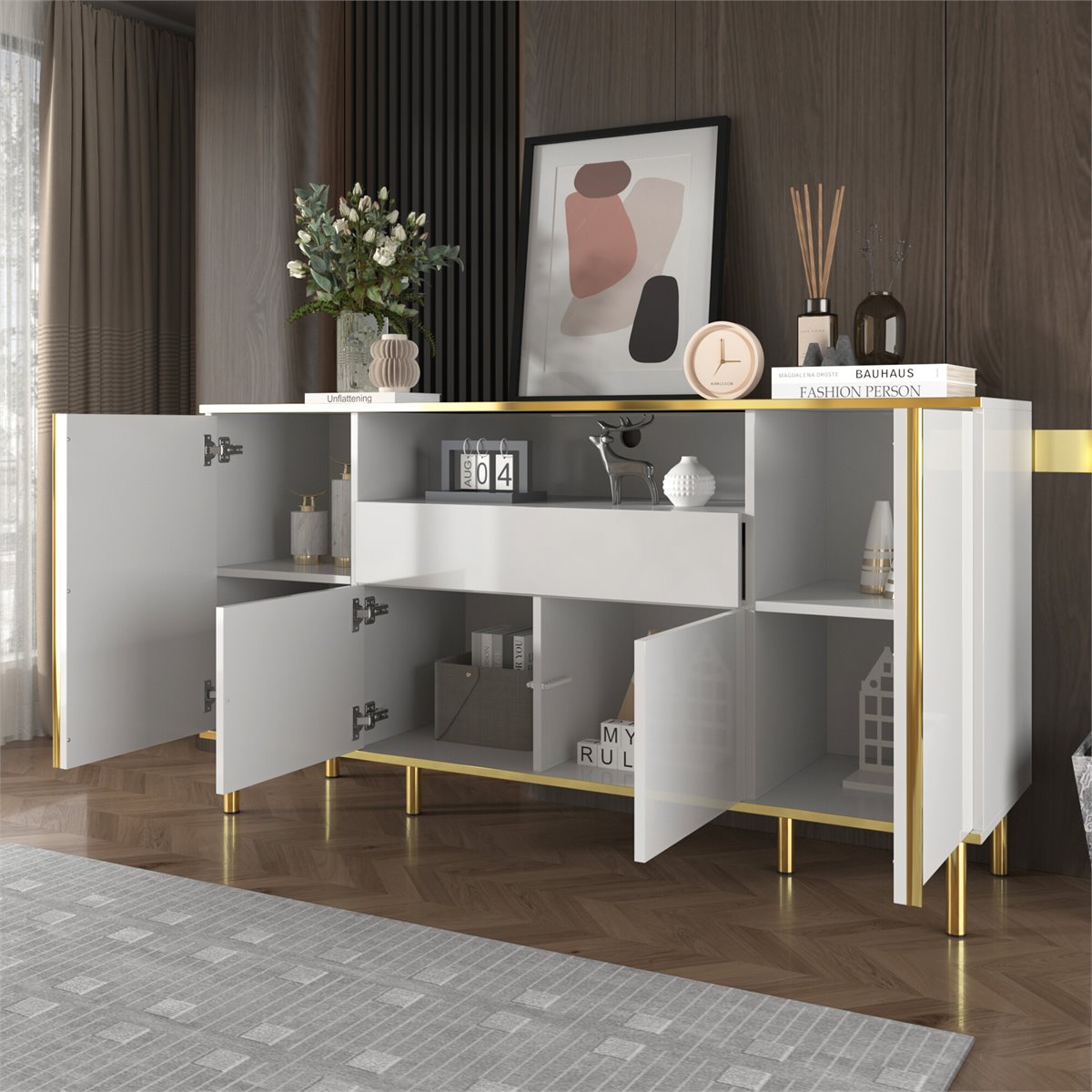 Este aparador de 150 x 40 x 80 cm redefine a elegância com o seu acabamento em branco brilhante e detalhes em dourado. Oferece uma solução de arrumação multifuncional graças às suas quatro portas, uma gaveta e um compartimento amplo. A iluminação LED integrada cria um ambiente acolhedor, enquanto os detalhes em dourado e a construção de alta qualidade tornam este móvel tão elegante quanto durável.