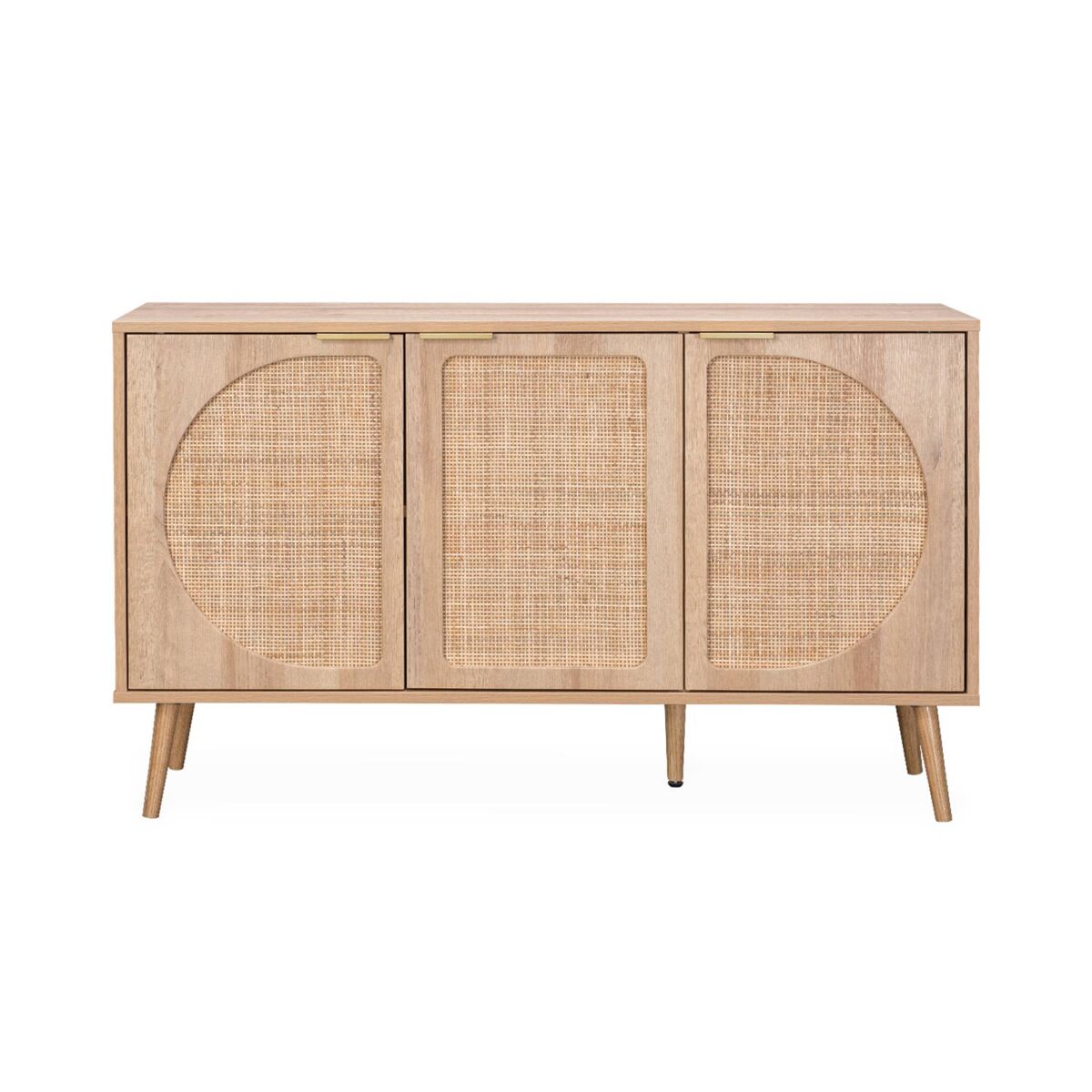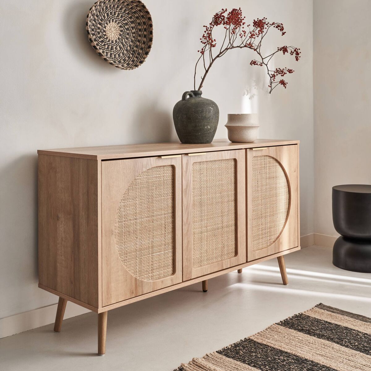 Deixe o aparador EVA entrar em sua casa! Com uma estrutura em madeira e elegantes portas arredondadas em rotim, será certamente a peça central de qualquer interior. As pernas em bússola de inspiração escandinava dão um toque de sofisticação, enquanto os puxadores em metal dourado realçam a beleza desta peça de mobiliário. O amplo tampo oferece muito espaço para objectos decorativos, como livros, candeeiros, velas perfumadas e molduras para fotografias. Autêntico e moderno, este aparador encantador traz calor e leveza a qualquer espaço de vida.