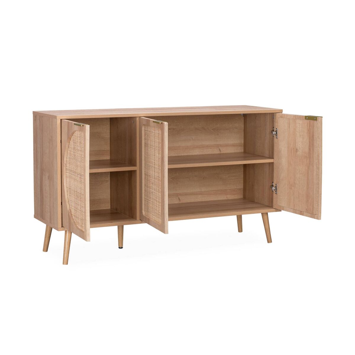 O aparador EVA é perfeito para dar um toque elegante e funcional à sua casa. Os seus 2 níveis de arrumação no interior das portas arredondadas em cana permitem-lhe manter a loiça, os copos, os cobertores e outras peças de roupa arrumados e fora de vista. Por fim, as suas cinco pernas robustas, incluindo uma perna central de reforço, conferem estabilidade e fiabilidade ao aparador.