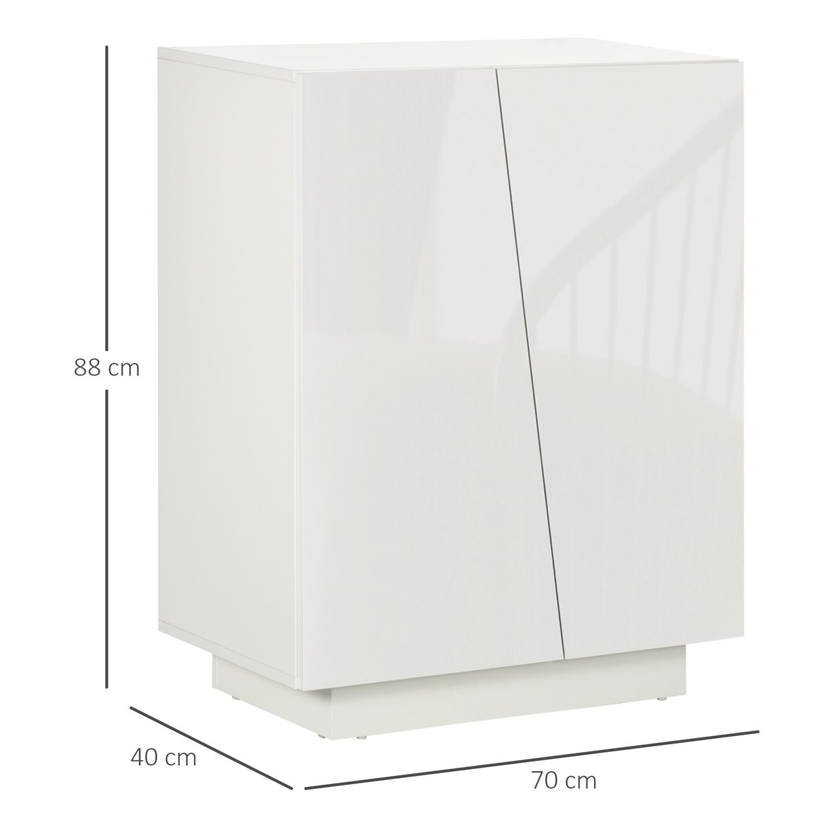 Mantenha sua casa limpa e sempre arrumada com este móvel multiuso da HOMCOM. De construção simples e clean, este aparador moderno possui três prateleiras internas que oferecem espaço suficiente para guardar seus itens, mantendo-os fora de vista e protegidos do pó. A porta de forma geométrica e o efeito brilhante fazem dela um excelente móvel para sala de estar, quarto, sala de jantar ou entrada Características: - Aparador com ampla bancada e 3 prateleiras interiores para guardar os seus artigos - As prateleiras do meio podem ser ajustadas em altura em 3 posições diferentes - Fabricado em melamina de madeira, oferece um desenho moderno, elegante e resistente - Com sistema anti-tombo para fixar na parede para maior segurança e estabilidade - A superfície laminada, além de oferecer um belo acabamento, é de fácil limpeza - A base elevada mantém os objetos fora do chão, protegendo-os da humidade - Dobradiças de aço garantem abertura fácil e fechamento suave - Requer montagem Especificaciones: - Cor: Branco - Material: Melamina de madeira - Medidas totais: 70x40x88 cm (CxLxA) - Medidas da bancada: 70x38,5 cm - Medidas de cada prateleira: 37x36,5x24,5 cm (CxLxA) - Altura da base: 8 cm - Capacidade máxima de peso: 15 kg (bancada), 5 kg (prateleira) e 40 kg (total) - Referência: 838-372V00WT O pacote inclui: - ● 1x Aparador multiuso; ● 1x Manual de instruções