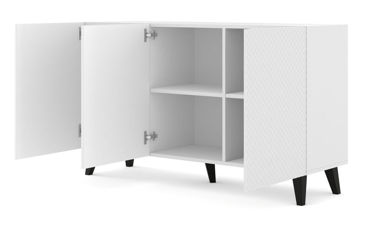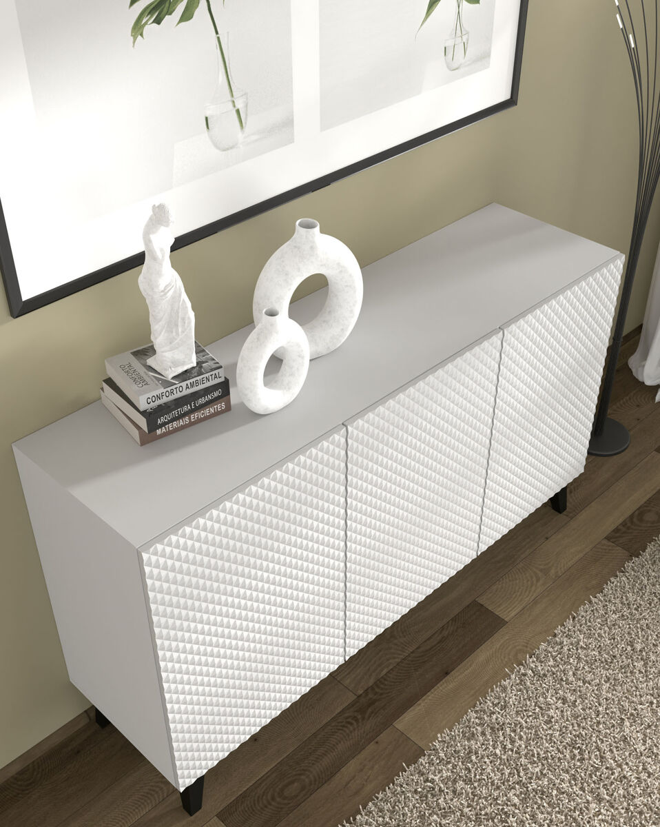 Gabinete RAVENNA PC em MDF diamante com acabamento branco fosco, brilho branco e pernas pretas. Medidas: 150 cm, 3 portas. Este gabinete apresenta um design único, com um acabamento branco fosco e brilho branco, combinado com pernas pretas que adicionam um toque de contraste. Suas 3 portas oferecem espaço de armazenamento para seus pertences.