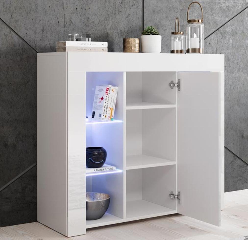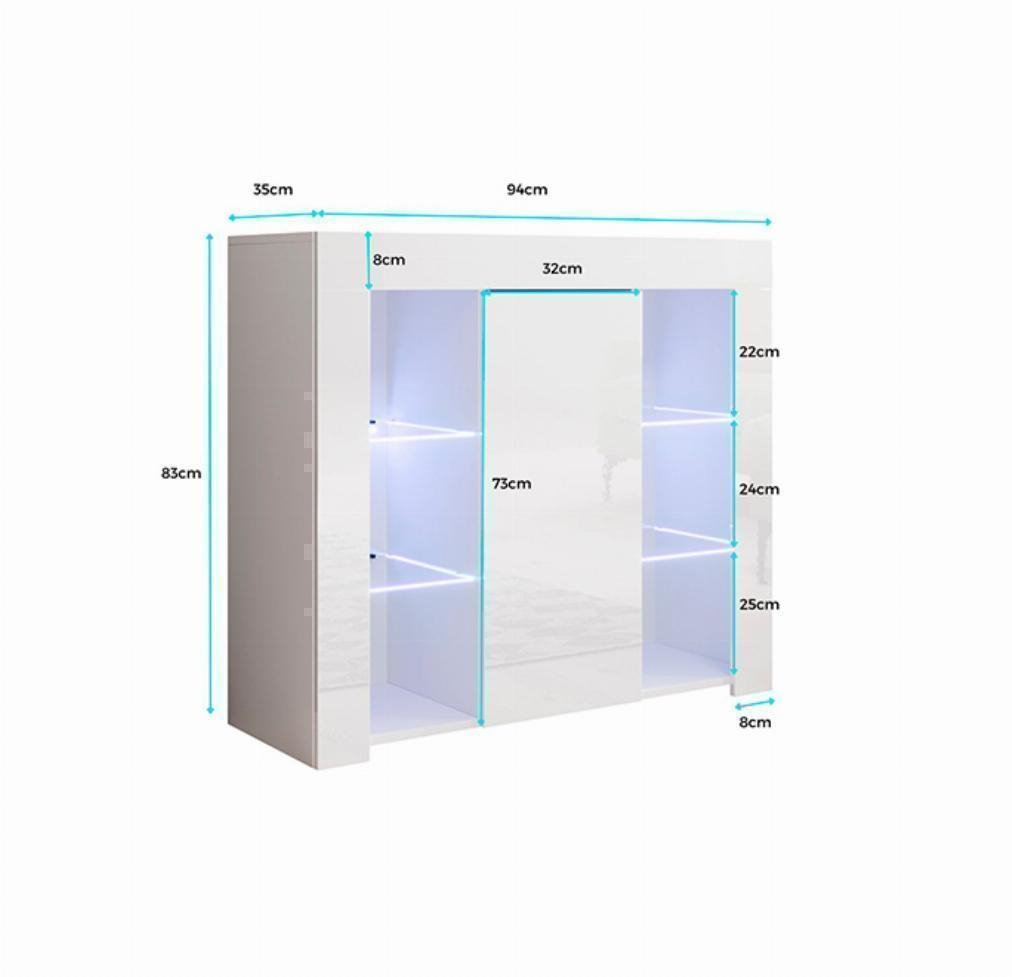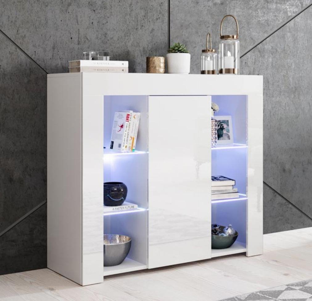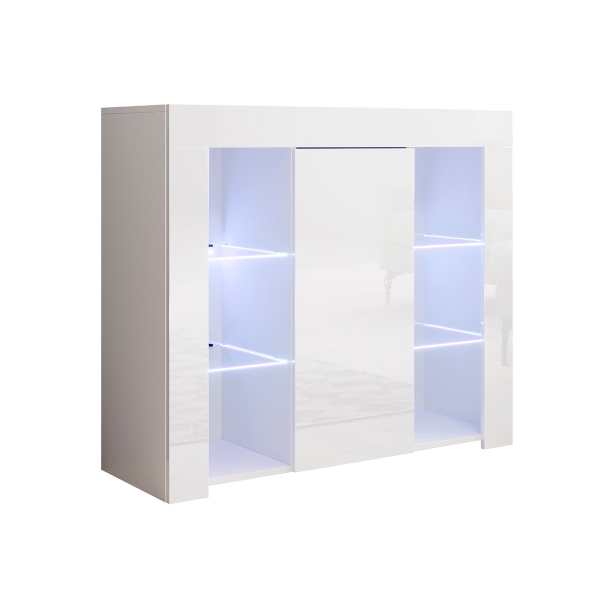 Este aparador destaca-se pelo seu design sem deixar a sua principal função de arrumação. Dá-nos um espaço extra para guardar artigos úteis na nossa sala de jantar, entrada ou sala de estar, dependendo de onde decidir colocá-lo. Tradicionalmente, os aparadores eram usados para a loiça, mas na atualidade têm múltiplas funcionalidades devido à sua versatilidade. Pelo design moderno dele, reforçado com luzes LED, também pode ser utilizado como minibar, deixando em primeiro plano os objetos mais decorativos.