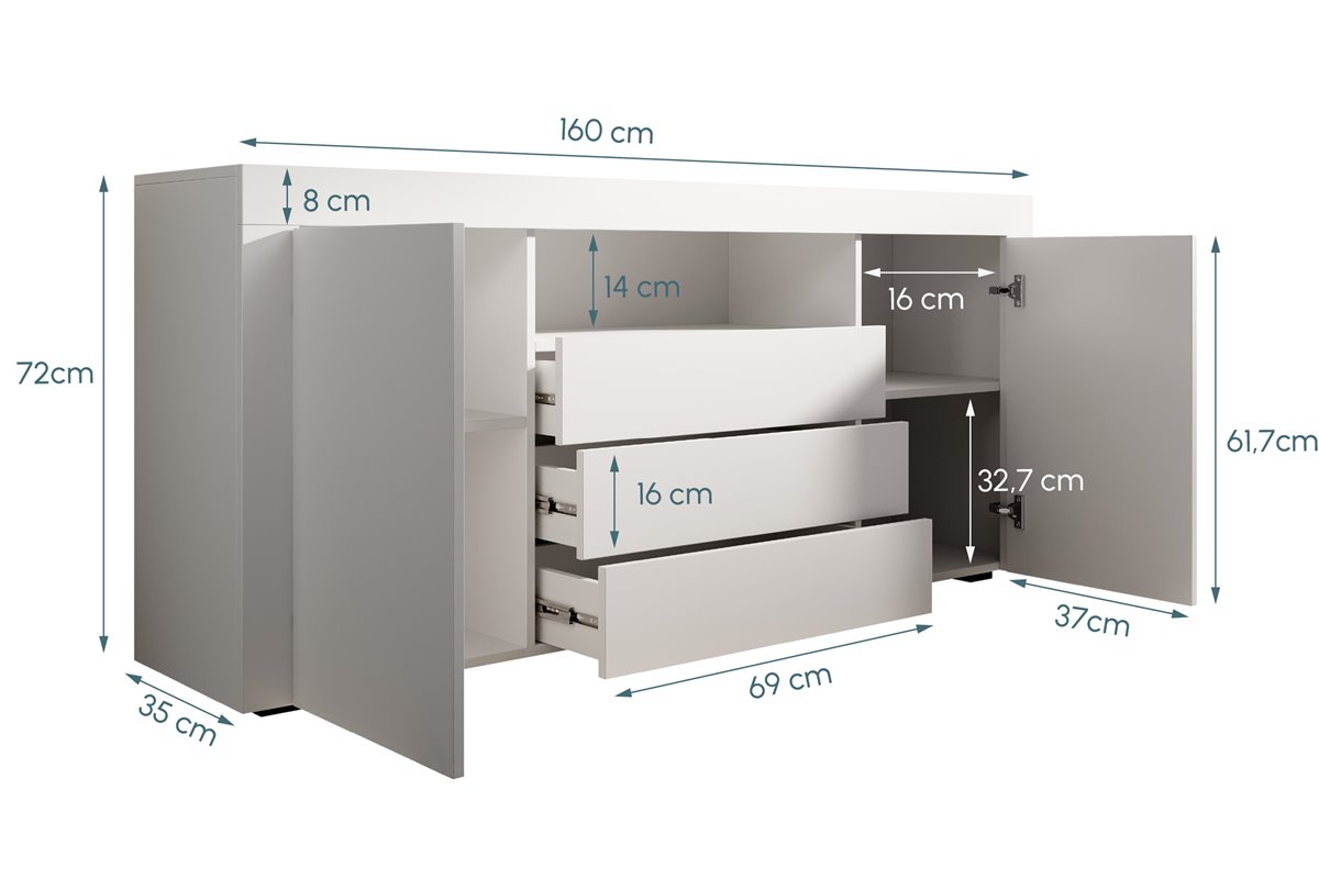 Duas portas e três gavetas com sistema de abertura push-clickGrande capacidade.