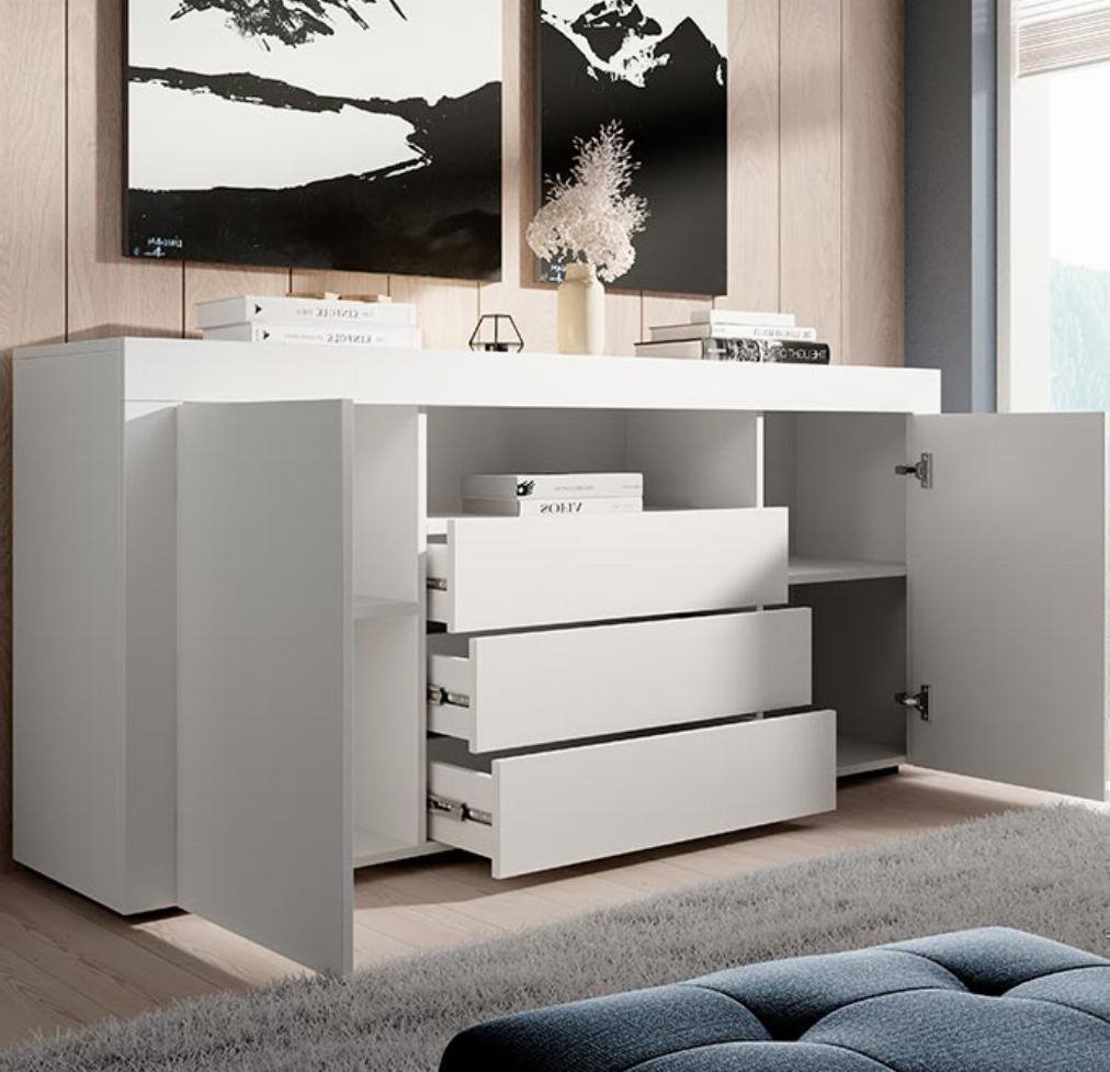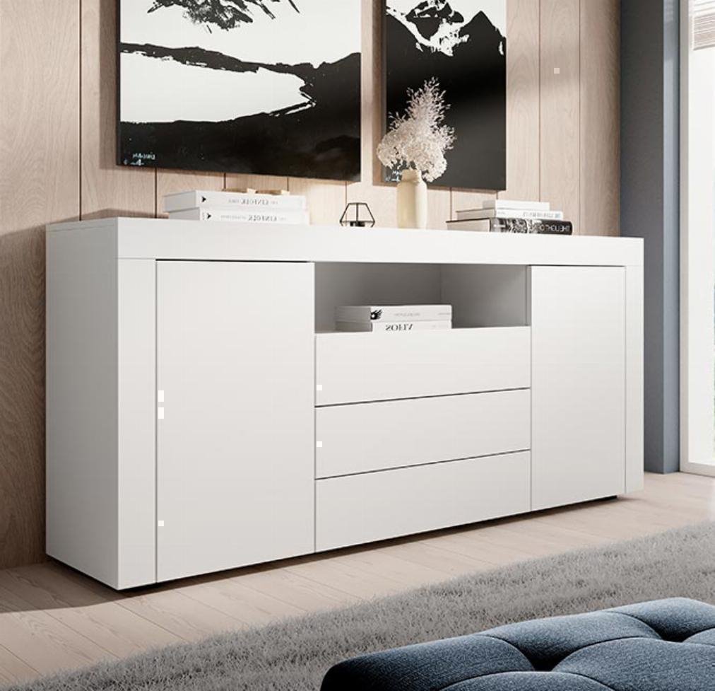 Aparador harmonioso e elegante com gavetas e portas que criam um jogo de alternâncias entre espaços retangulares que amenizam o mobiliário duma sala de estar atual. Atrás das portas dele pode-se organizar o serviço de mesa e colocar nas gavetas dele talheres ou peças mais pequenas. Deixa um espaço aberto que pode ser preenchido com objetos decorativos ou com elementos de uso frequente que deseja ter à mão.