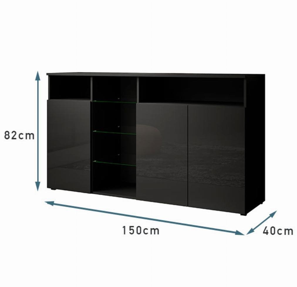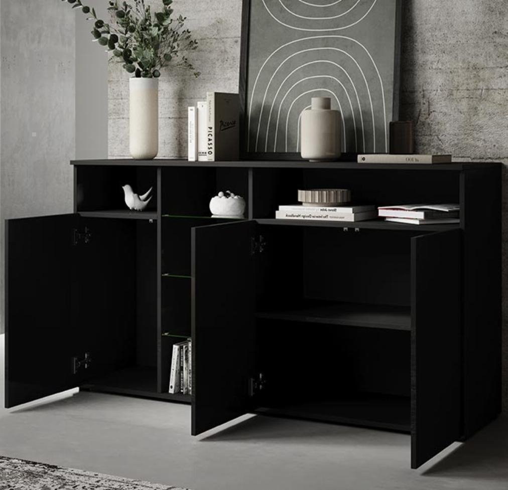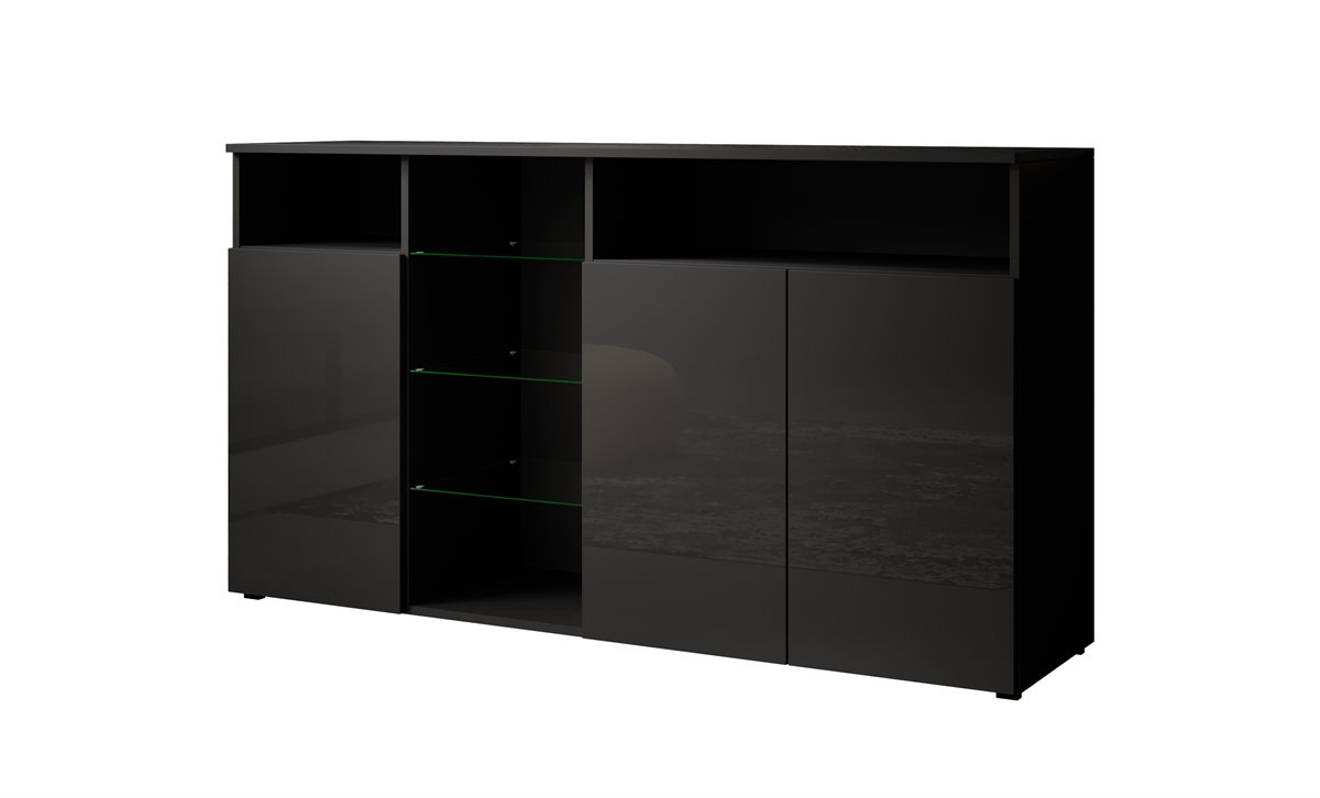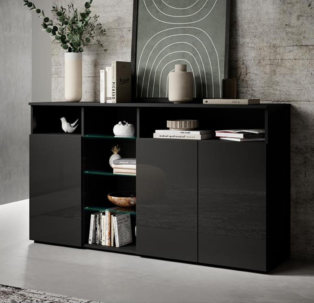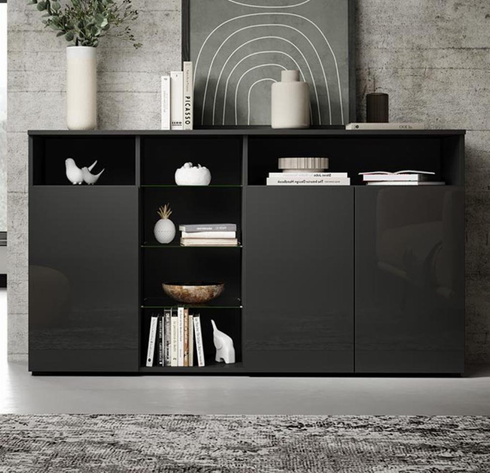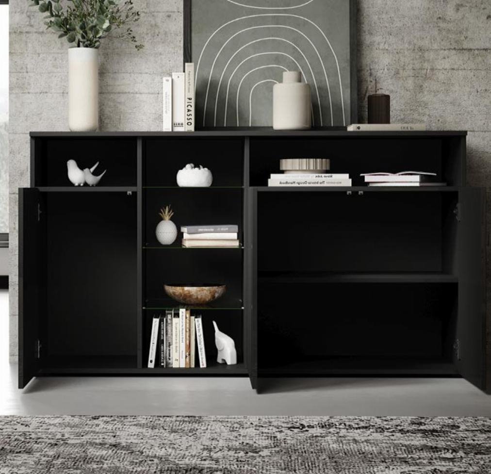 Moderno e elegante aparador de 3 portas com quatro compartimentos abertos separados por três prateleiras de vidro que serão muito úteis para guardar todos os seus objectos volumosos e decorativos, recuperando assim espaço na sua sala de jantar.
