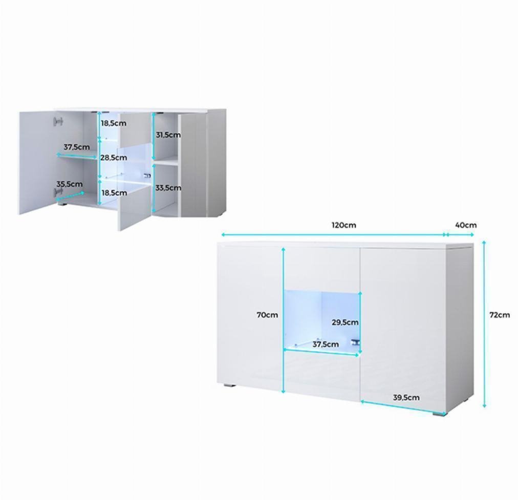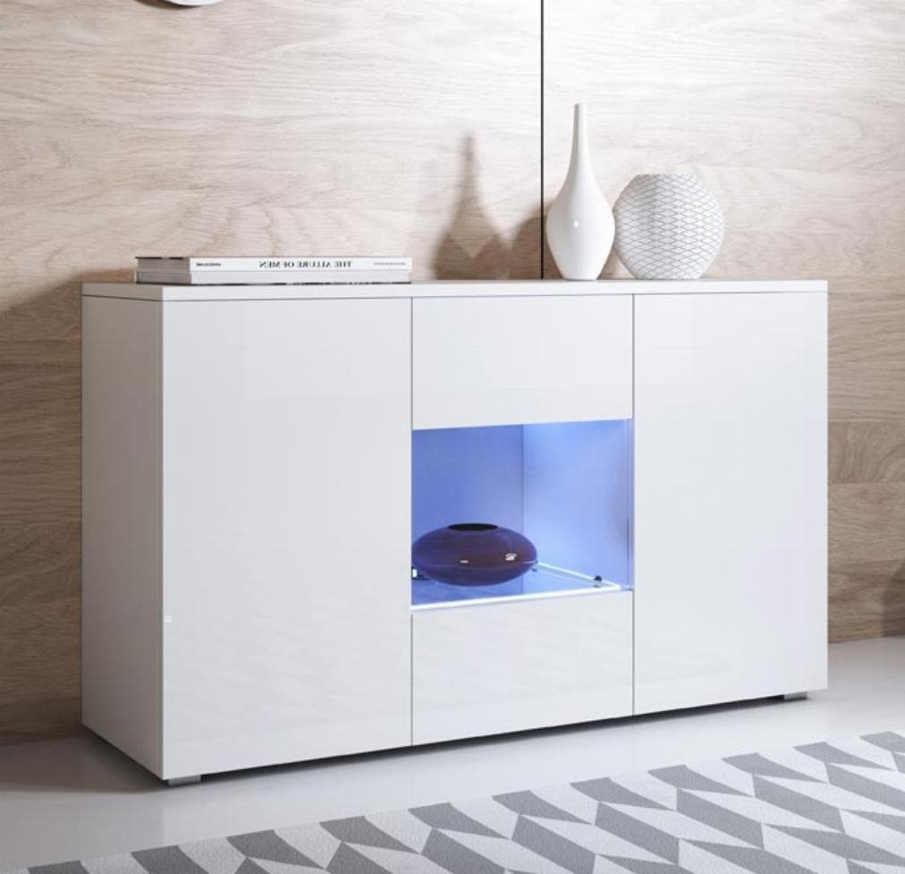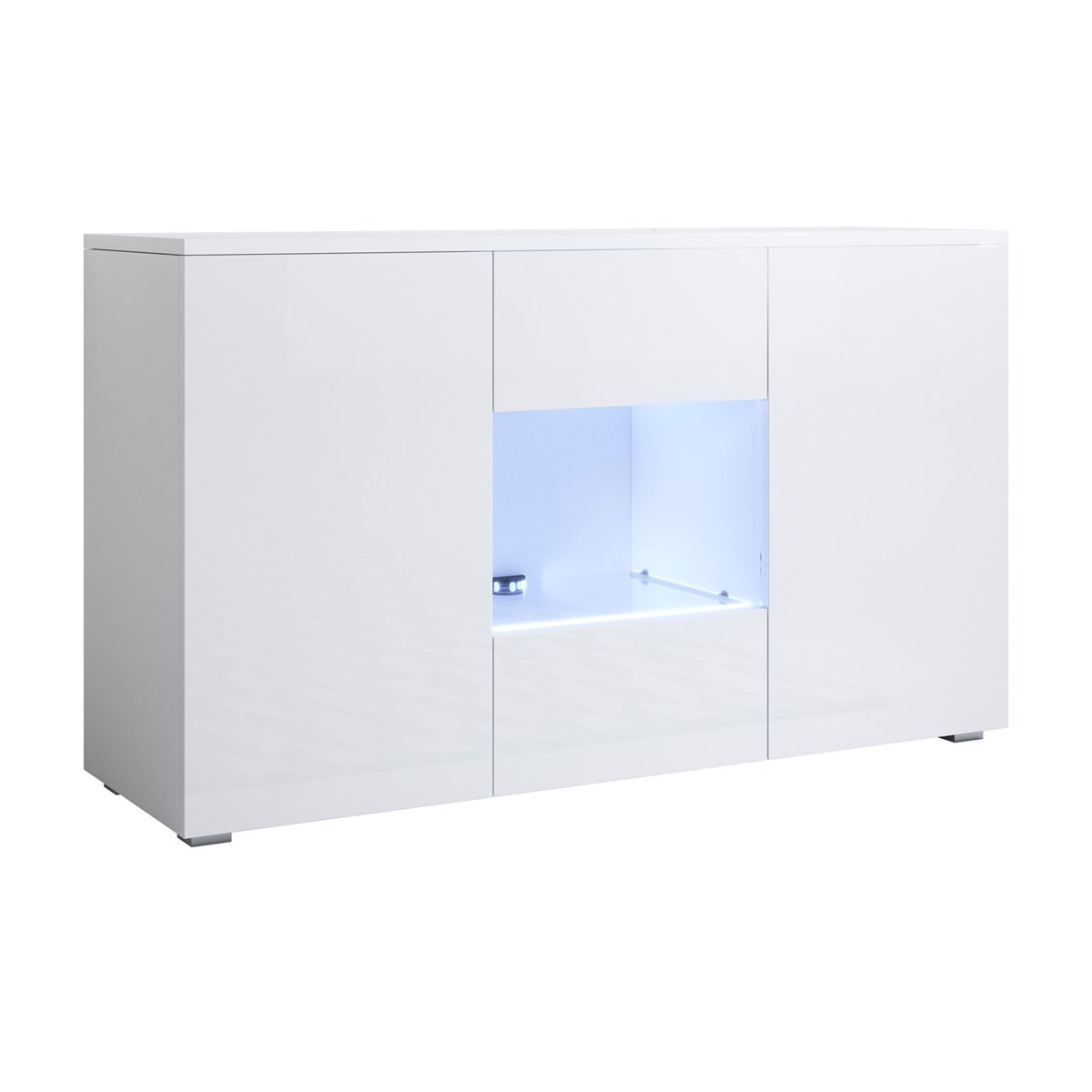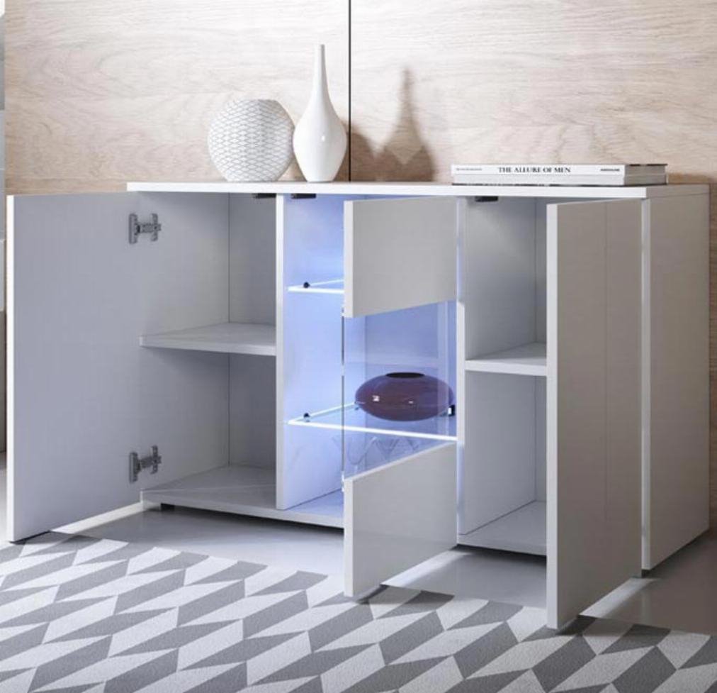 Aparador de design elegante e moderno. Todo o móvel tem acabamento brilhante que com certeza vai se adaptar perfeitamente à decoração da sua casa. O aparador oferece um amplo espaço interno que lhe permitirá organizar os talheres, copos, toalhas de mesa..., na superfície dele podem ser colocados objetos de decoração que vão dar personalidade à sua sala de estar ou jantar.
