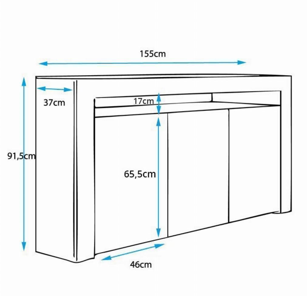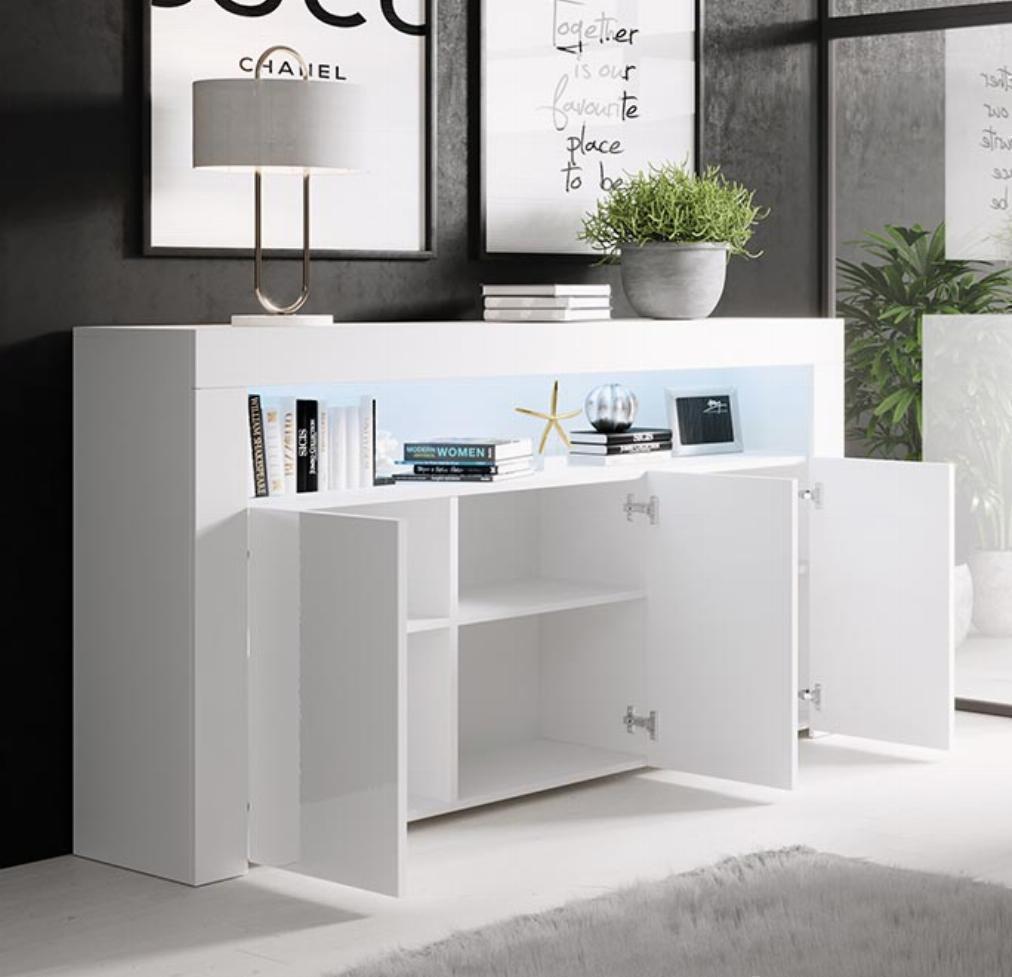 Fabuloso aparador com uma linha moderna, muito elegante e com iluminação LED. Tem três portas e uma área aberta iluminada com luz. A sua grande capacidade é muito útil para armazenar todos os seus objetos volumosos e recuperar espaço na sua sala de jantar.