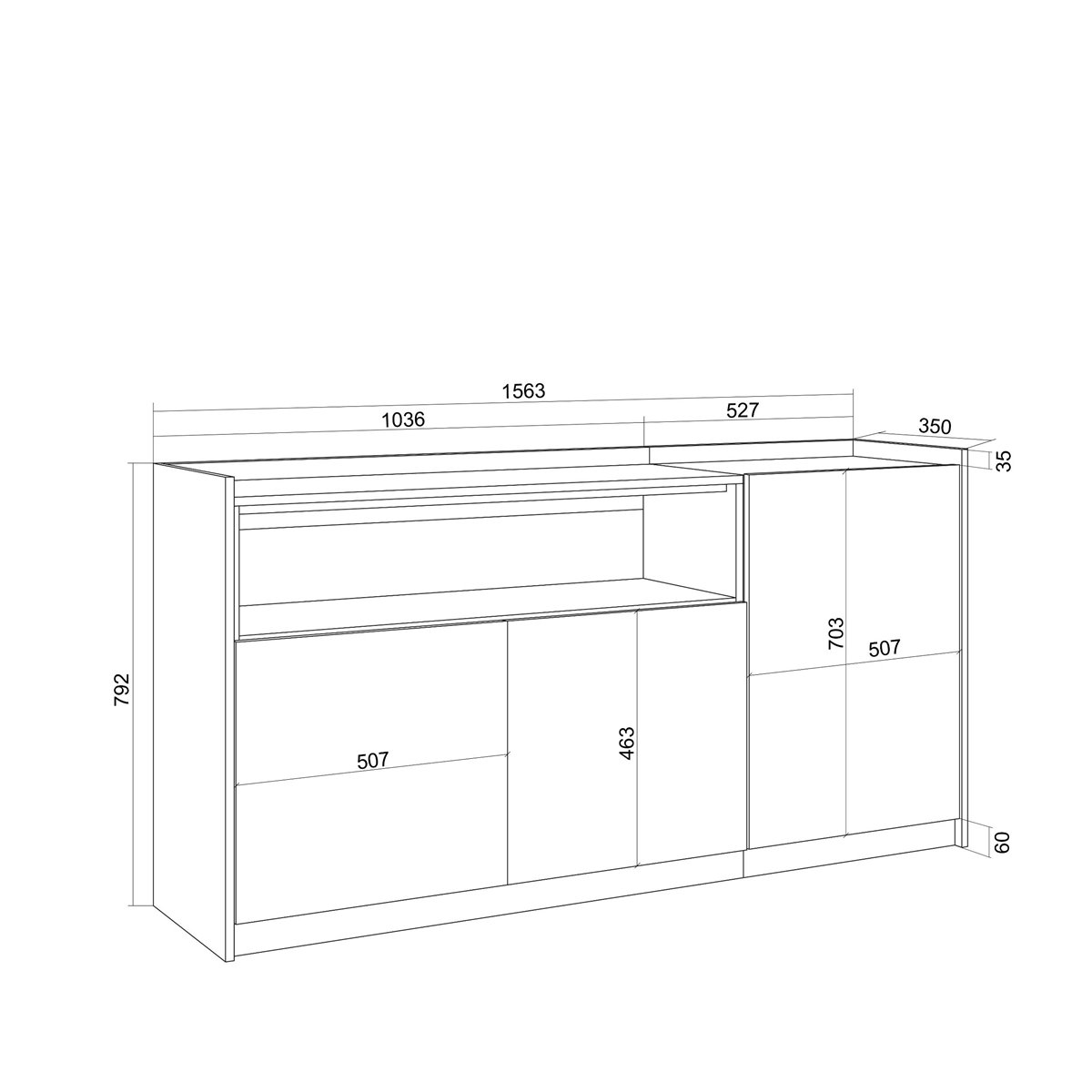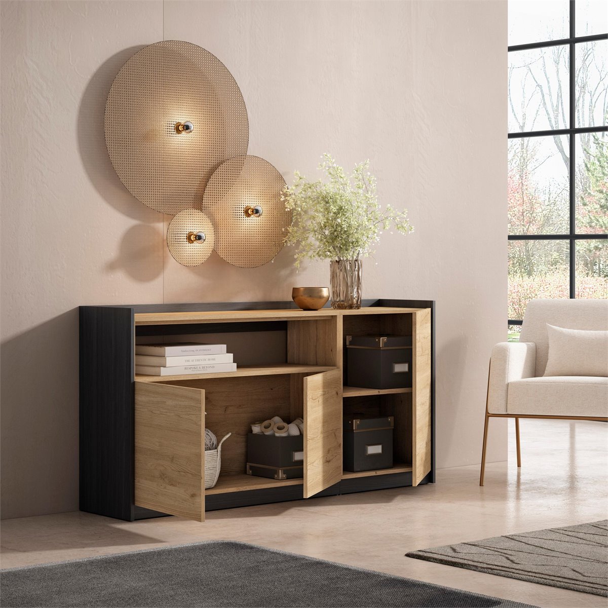 Módulo com 2 portas, grande capacidade de arrumação. Dimensões do módulo: 104 cm. de largura, 80 cm. de altura, 37 cm. de profundidade. Cor Preto e Carvalho com grão de madeira de tato poroso de alta qualidade.