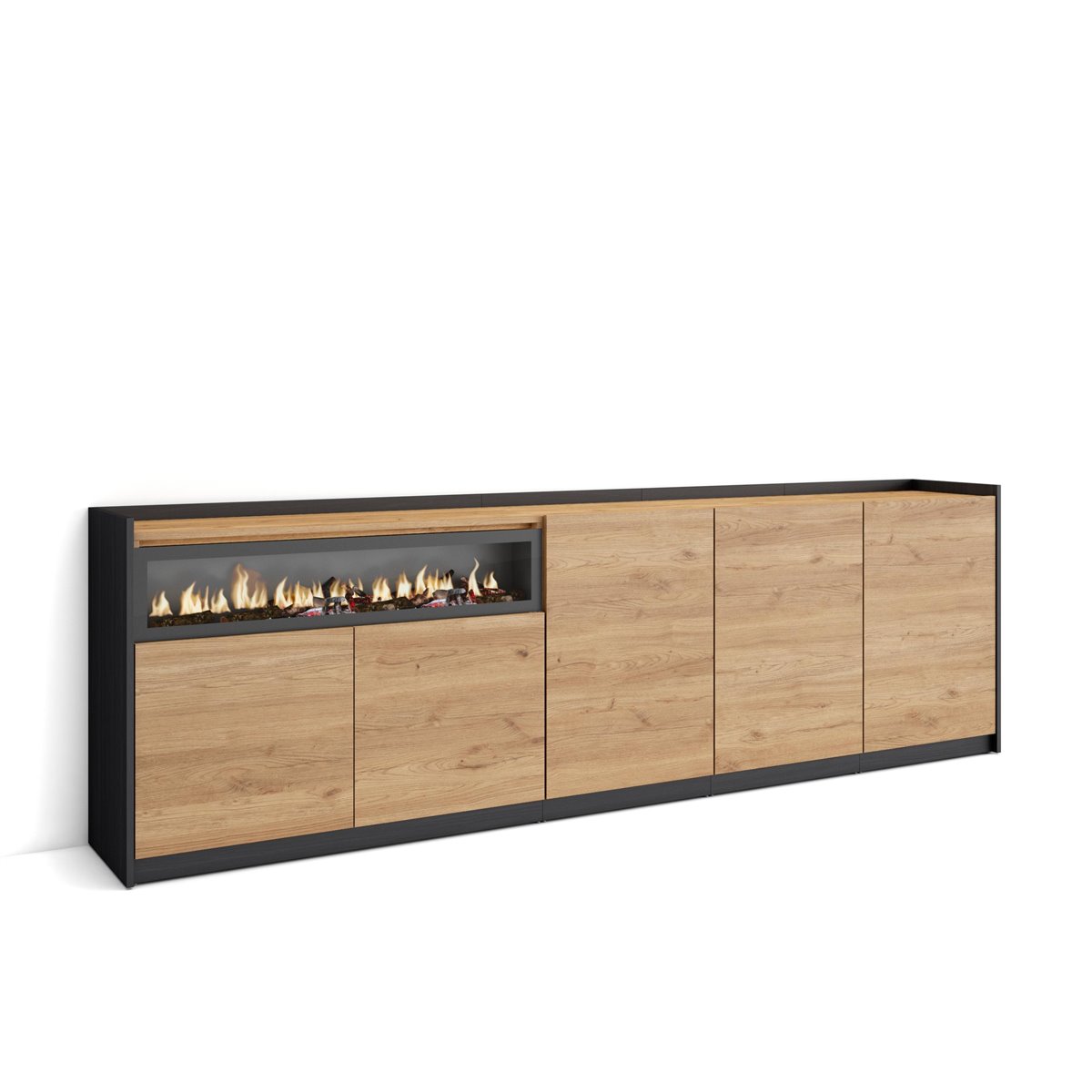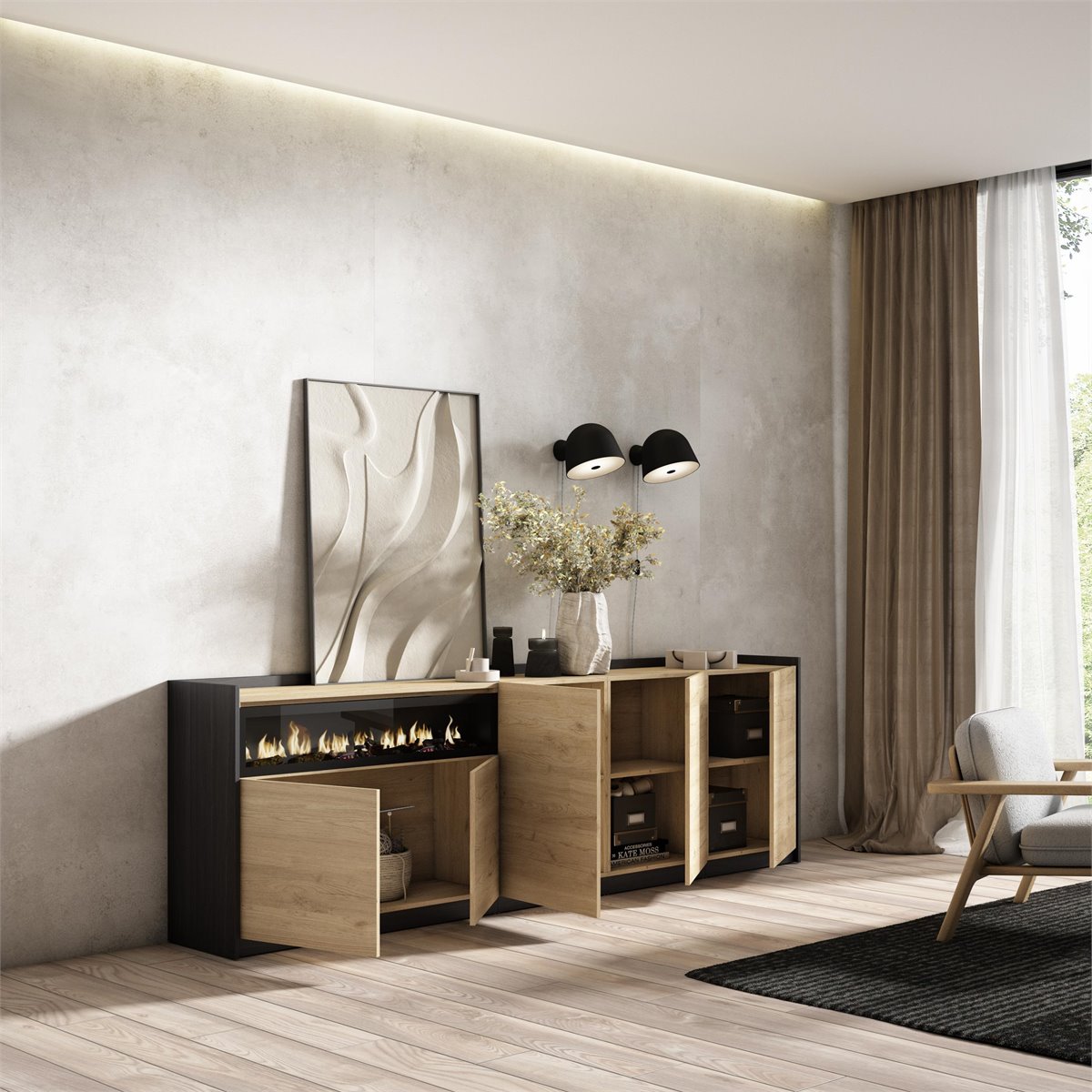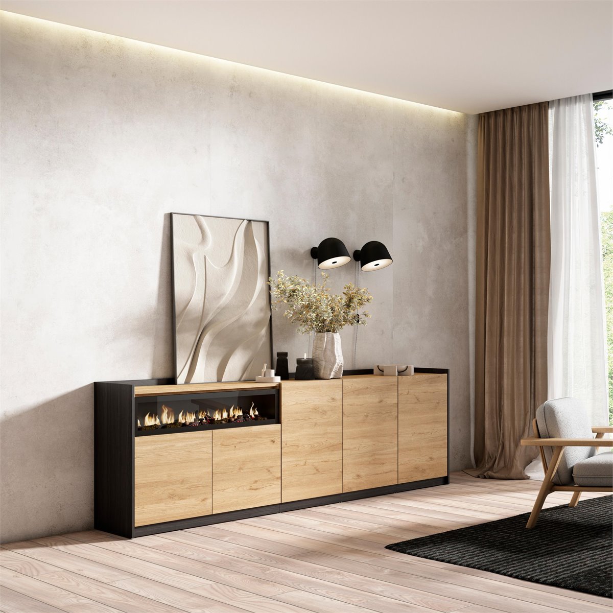Módulo com porta, prateleira divisória interna. Dimensões do módulo: 52 cm. de largura, 80 cm. de altura, 37 cm. de profundidade. Cor Preto e Carvalho com grão de madeira de tato poroso de alta qualidade.Lareira eléctrica LED. Dimensões: 102cm. de largura, 21cm. de altura. Efeito de fogo 3D incrivelmente realista. Sem risco de queimaduras, pois não incorpora nenhuma fonte de calor. Potência: 34w. Inclui controlo remoto e 3 níveis de intensidade. A lareira elétrica funciona conectada à eletricidade, não utiliza pilhas. O controle remoto requer pilhas, que não estão incluídas.