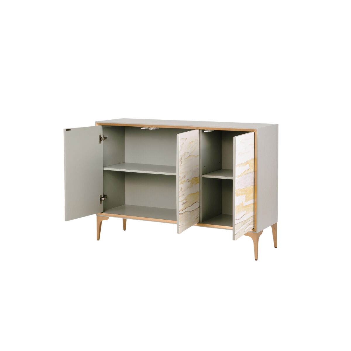 O aparador Stilig, com um elegante acabamento cinzento, proporciona uma solução de arrumação moderna com um toque de elegância. Com 89 cm de altura e 130 cm de largura, esta peça possui duas portas com dobradiças e três prateleiras, fabricadas em madeira de engenharia com um robusto acabamento em melamina. O seu estilo glamoroso e o interior espaçoso tornam-na ideal para manter organizados os artigos essenciais para refeições ou dispositivos multimédia, ao mesmo tempo que realça a estética de qualquer espaço contemporâneo.