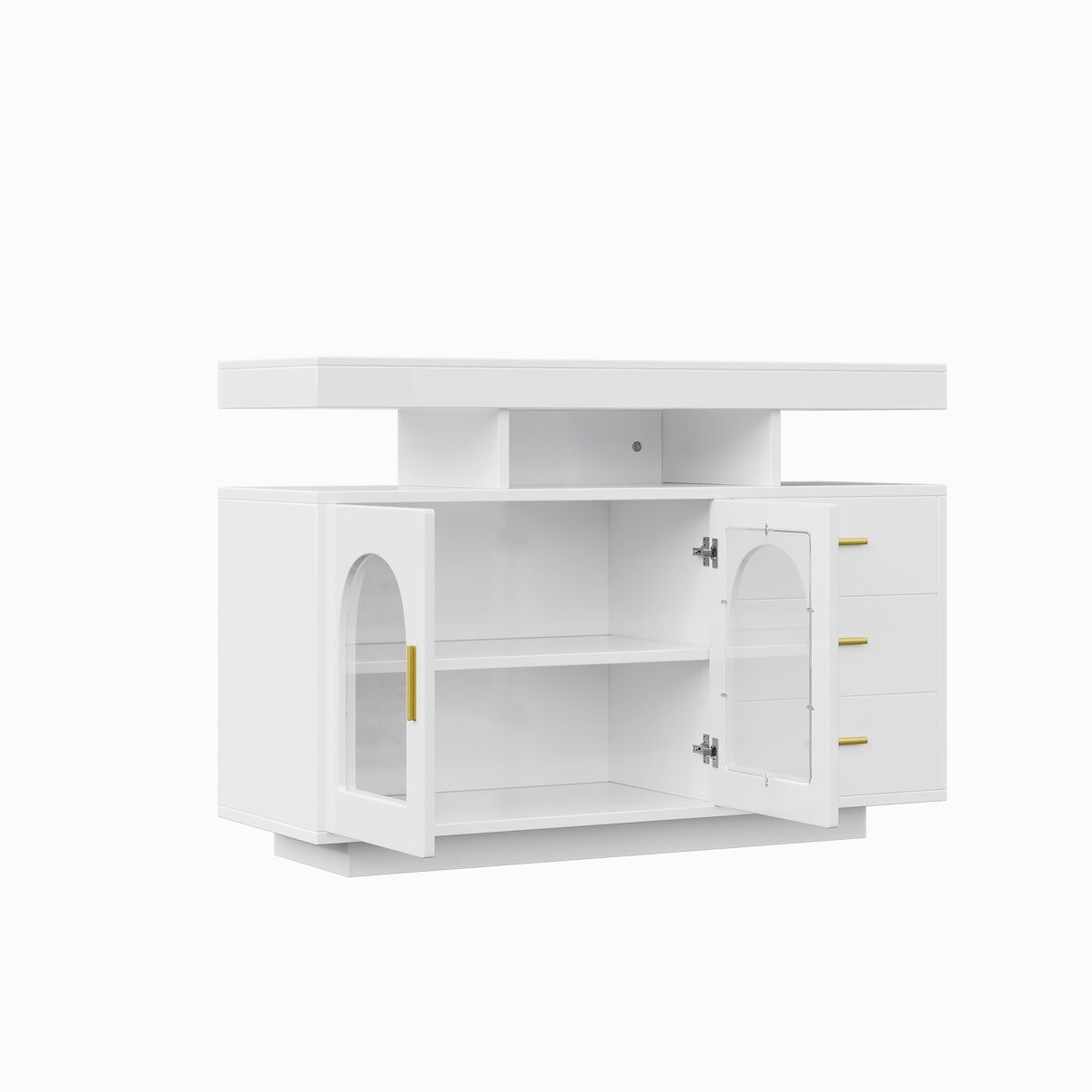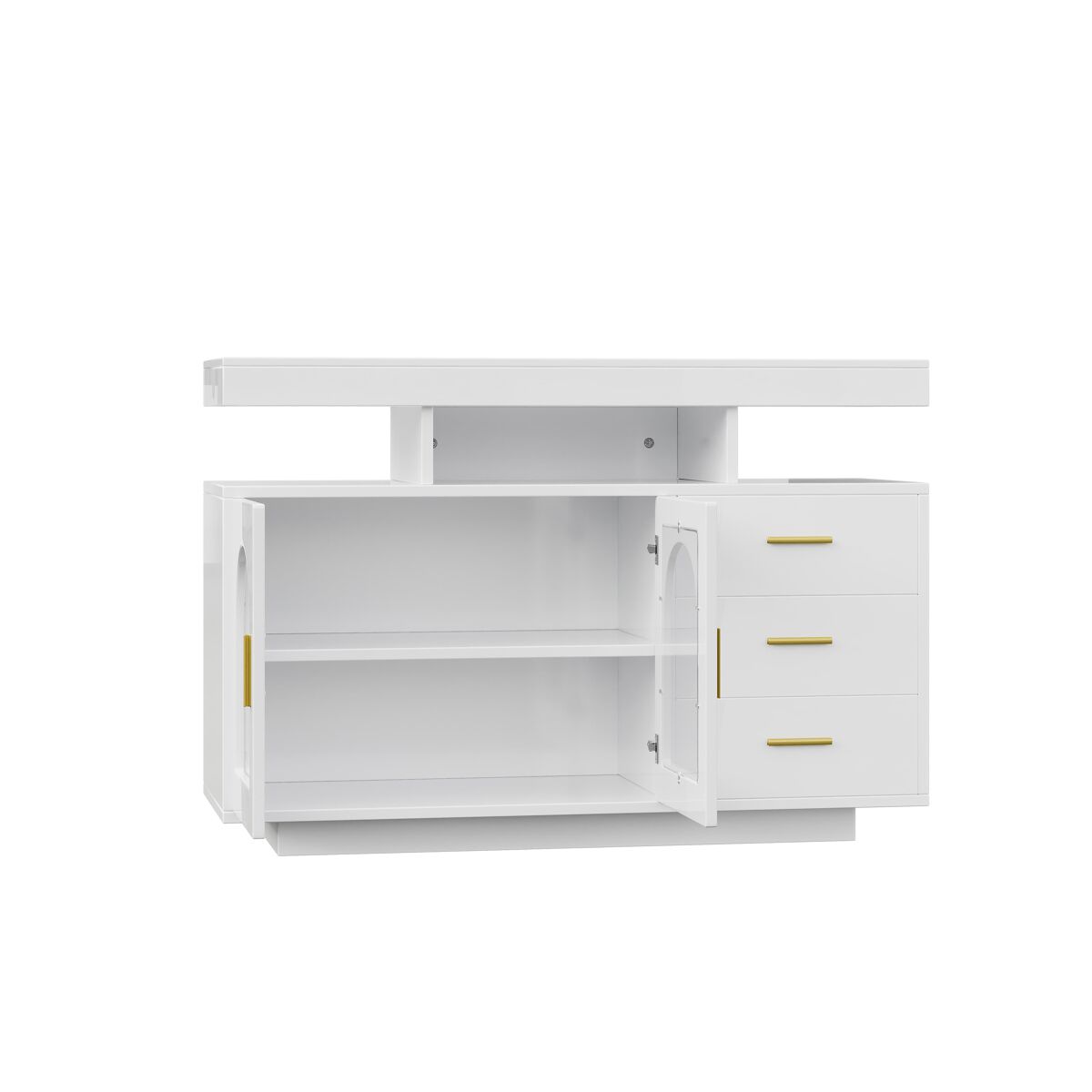 - Amplo espaço de armazenamento com três gavetas, um grande armário e quatro compartimentos abertos.