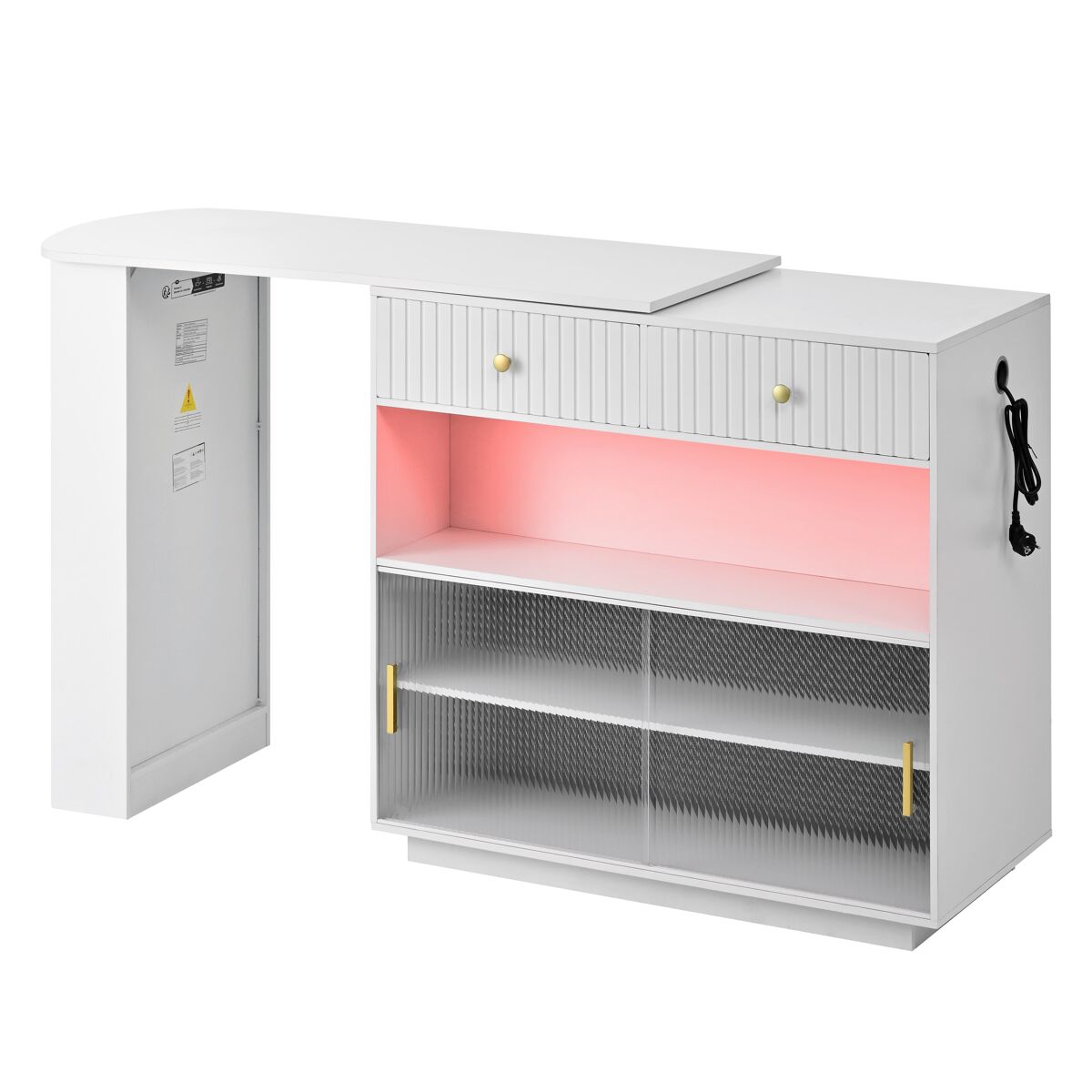 - Iluminação LED integrada com várias cores para criar um ambiente acolhedor (o efeito varia de acordo com a cor do móvel)