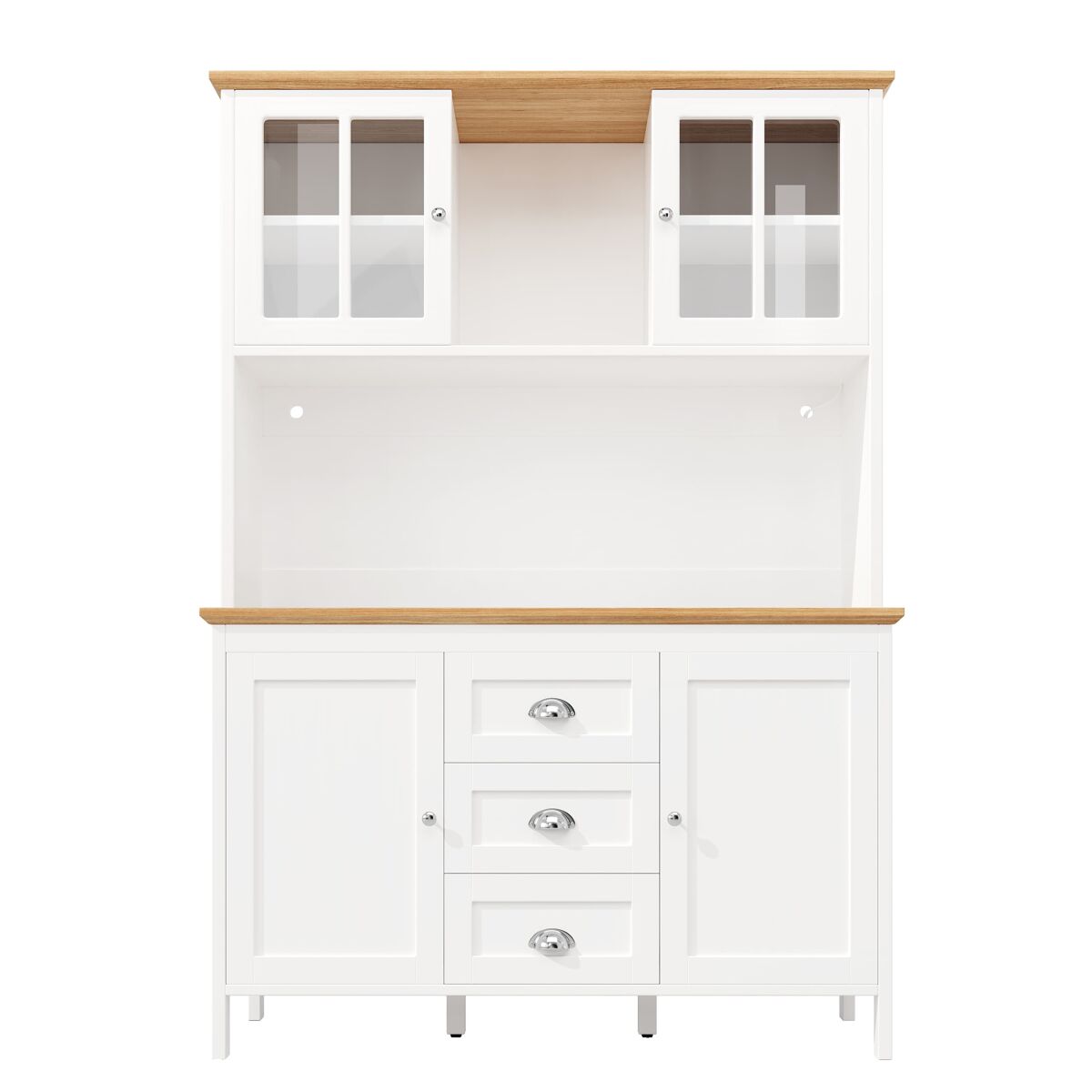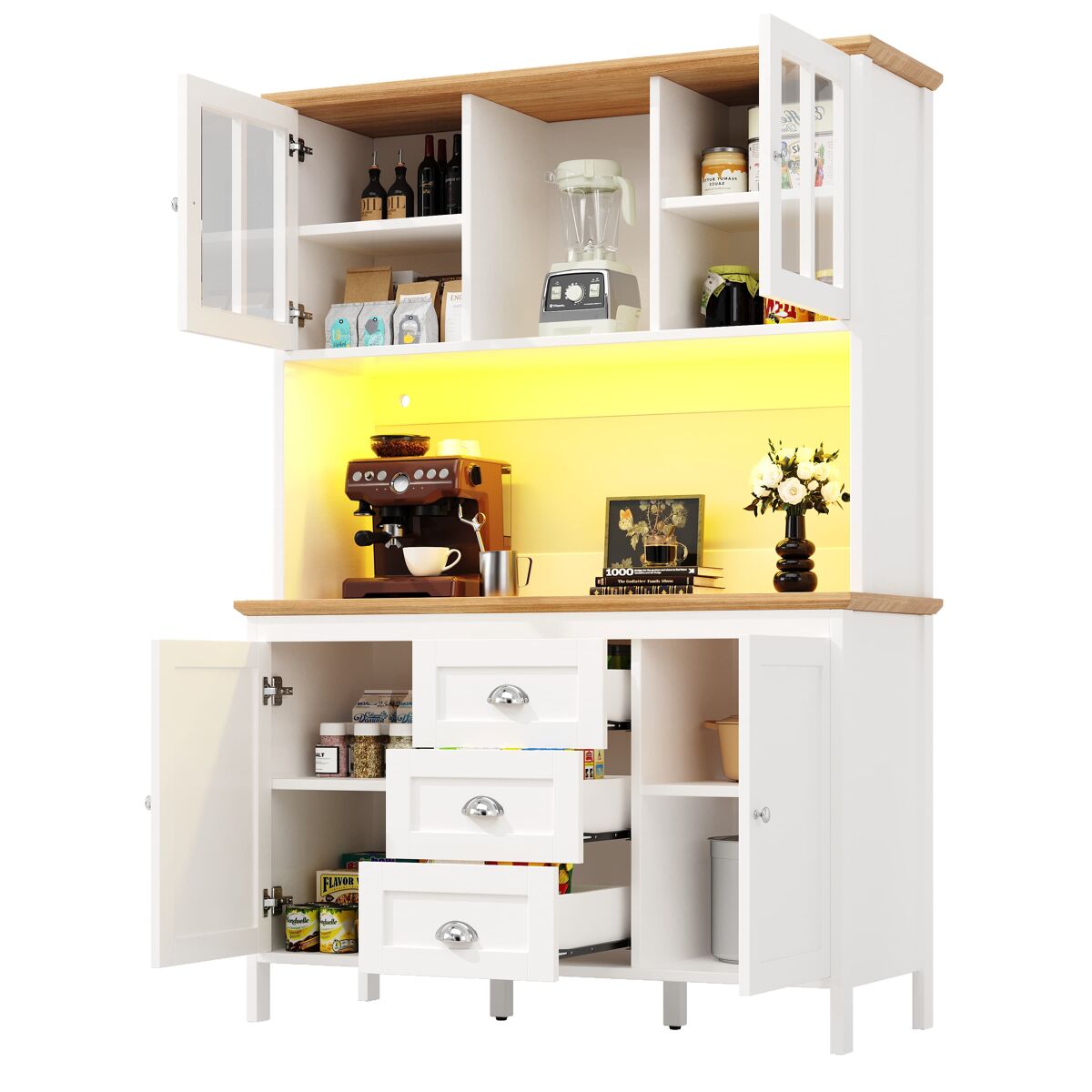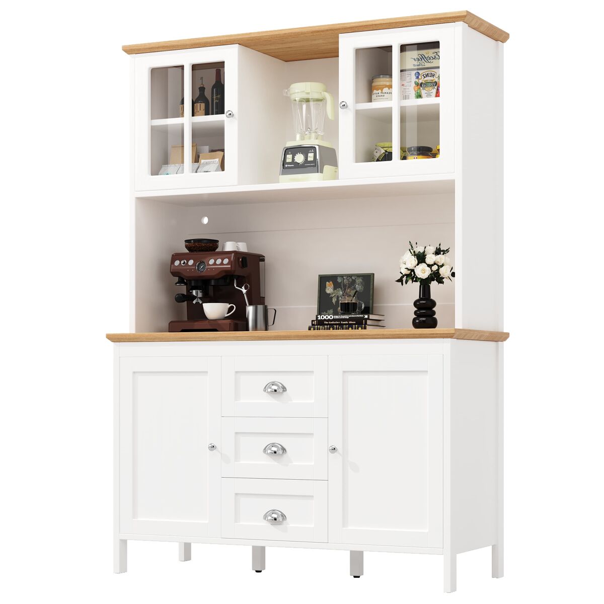 - Design inteligente com 4 portas, 3 gavetas grandes e prateleira aberta para organizar utensílios, louças ou decoração.