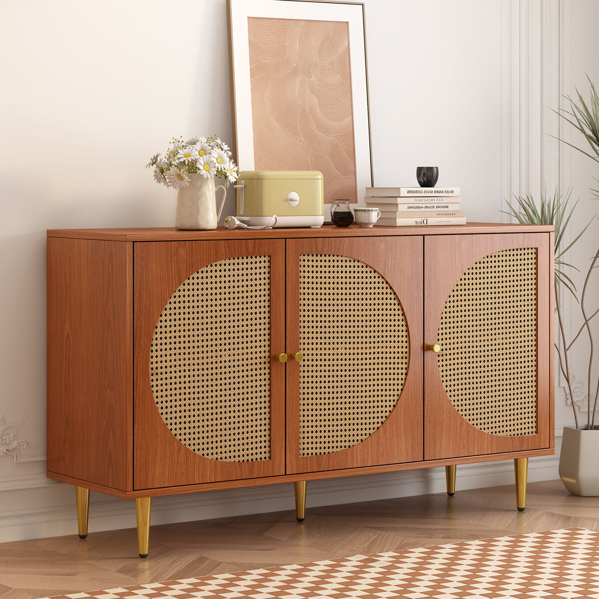 O charmoso aparador com três portas adornado com uma elegante trama de rotim é elegante e moderno. Dá um toque elegante a qualquer divisão.