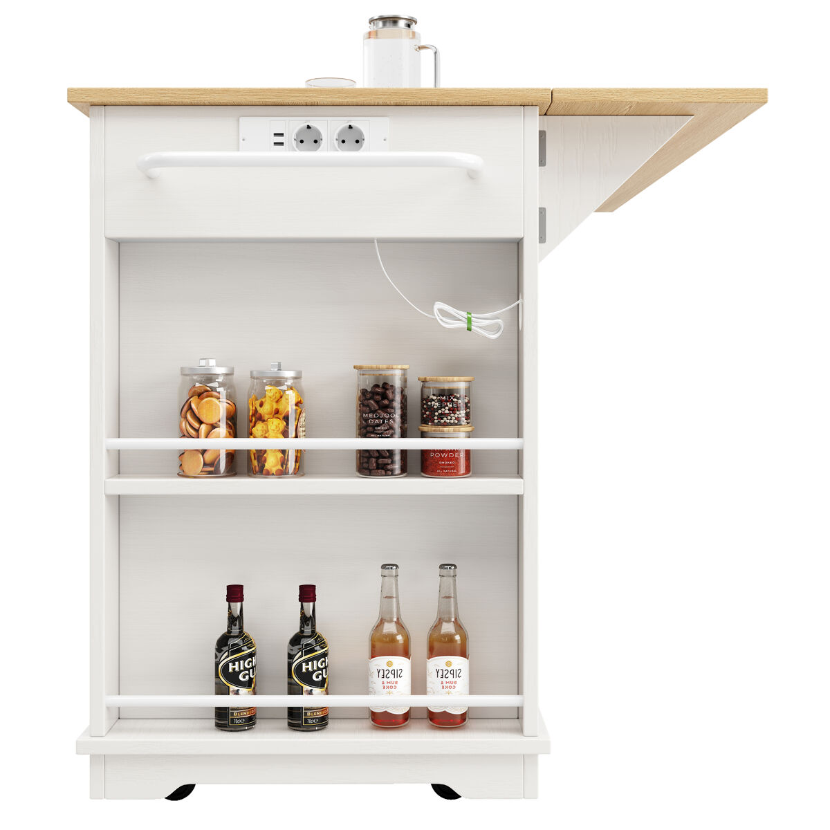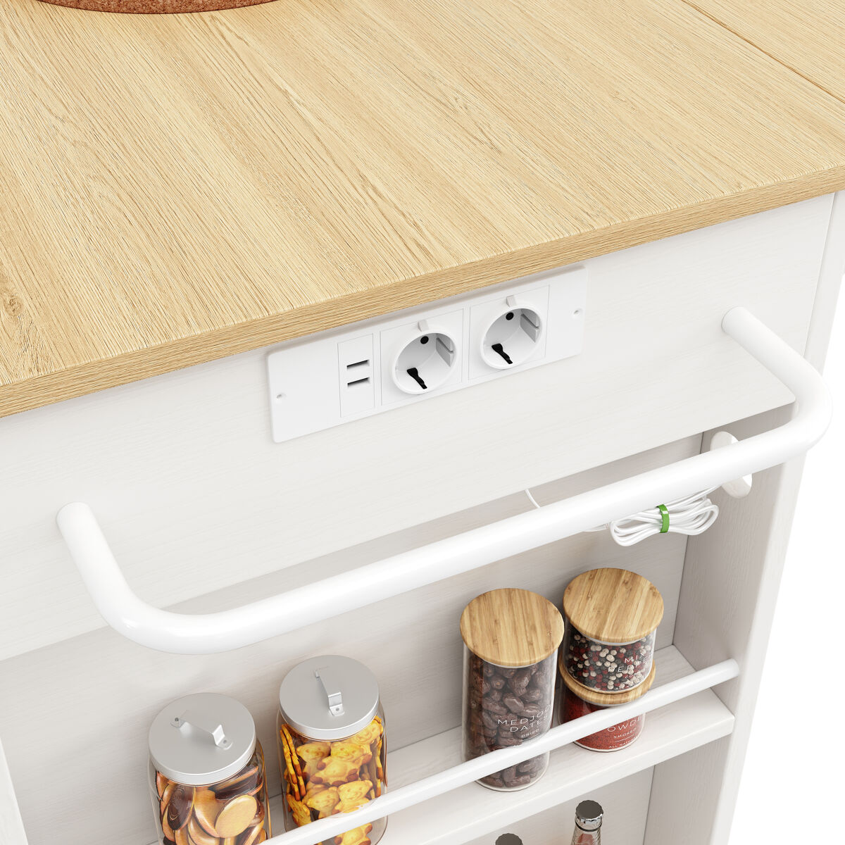 O carrinho tem um design compacto e está equipado com tomadas na lateral, o que facilita a ligação de vários aparelhos de cozinha, como placas de indução, máquinas de café ou pequenos frigoríficos.