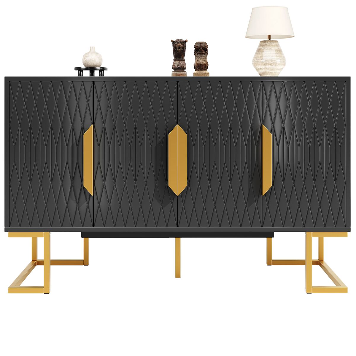 - Design em cor preta com detalhes elegantes, incluindo portas com padrões geométricos e pés metálicos dourados.