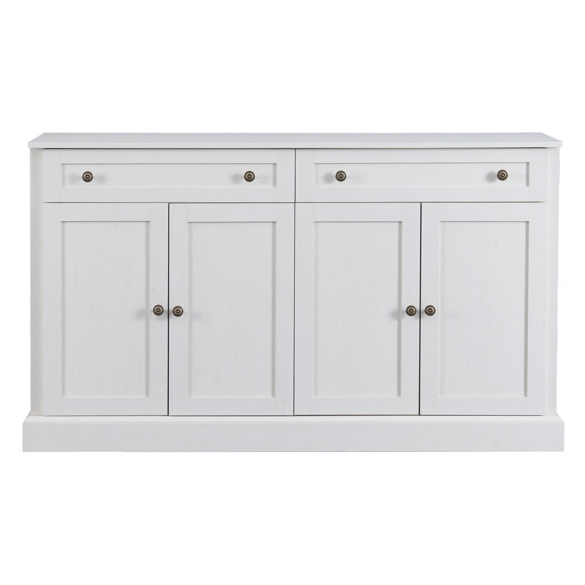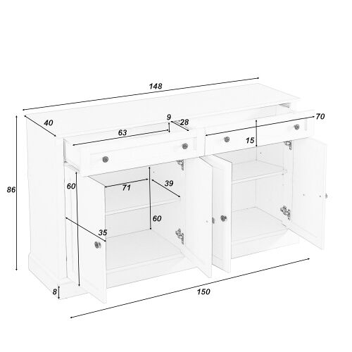 Este grande aparador tem quatro portas e duas gavetas. Pode optar por colocá-lo na cozinha, na sala de estar ou no quarto e guardar o que quiser, consoante a ocasião. Este aparador pode satisfazer as suas necessidades de arrumação. Dimensões do produto: 150 × 40 × 86 cm (C/P/A/A).