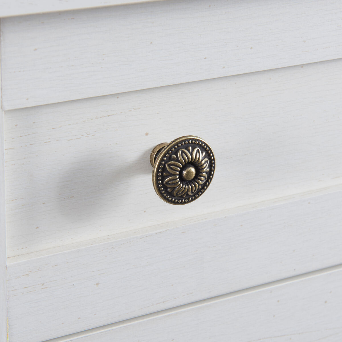 O aparador tem duas prateleiras reguláveis. Pode ajustar ou retirar as prateleiras em três alturas diferentes, de acordo com as suas necessidades. O puxador redondo em metal tem um aspeto muito texturado. O design linear dos painéis das portas e das gavetas realça o efeito tridimensional. Todos os pormenores deste móvel requintado merecem atenção.