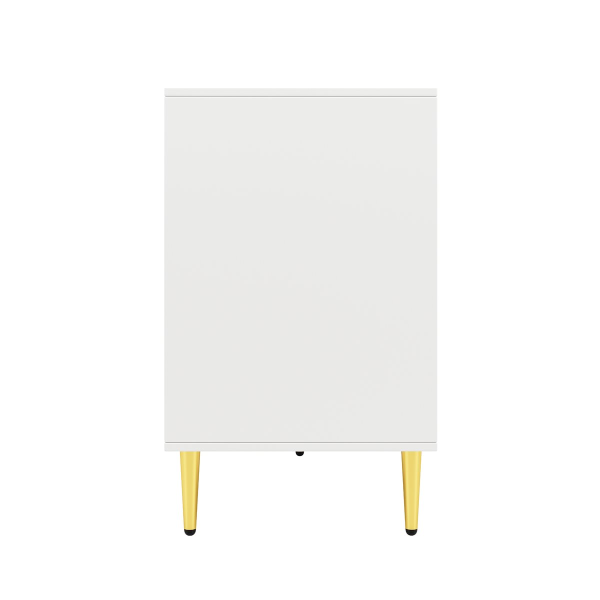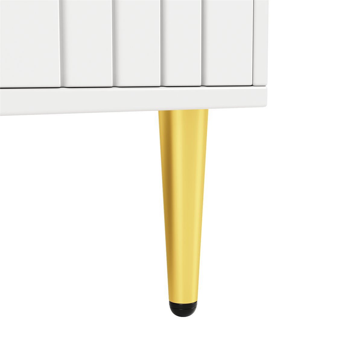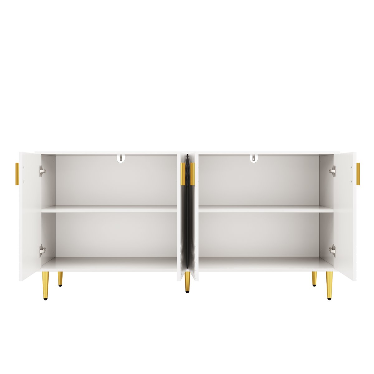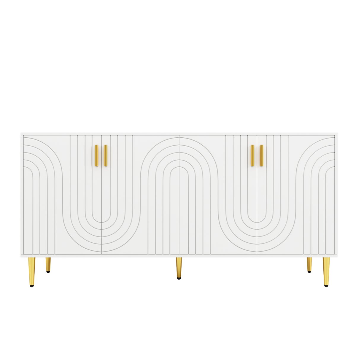 Este armário de arrumação apresenta um estilo moderno e luxuoso. A superfície de cor clássica contrasta fortemente com o puxador e os pés em metal dourado, demonstrando nobreza e elegância. O padrão decorativo ondulado único é o toque final, acrescentando uma nuance artística a toda a peça de mobiliário.