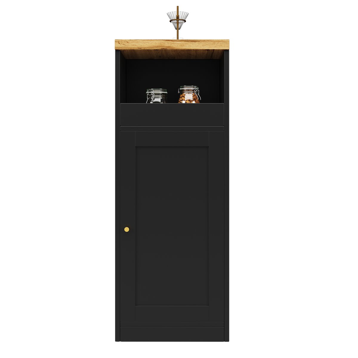 A combinação clássica de um armário preto mate e de uma mesa de secretária em madeira dá um toque simples e luxuoso. Quer seja na sala de jantar, na sala de estar ou na cozinha, esta mesa de bar adapta-se facilmente a qualquer interior.
