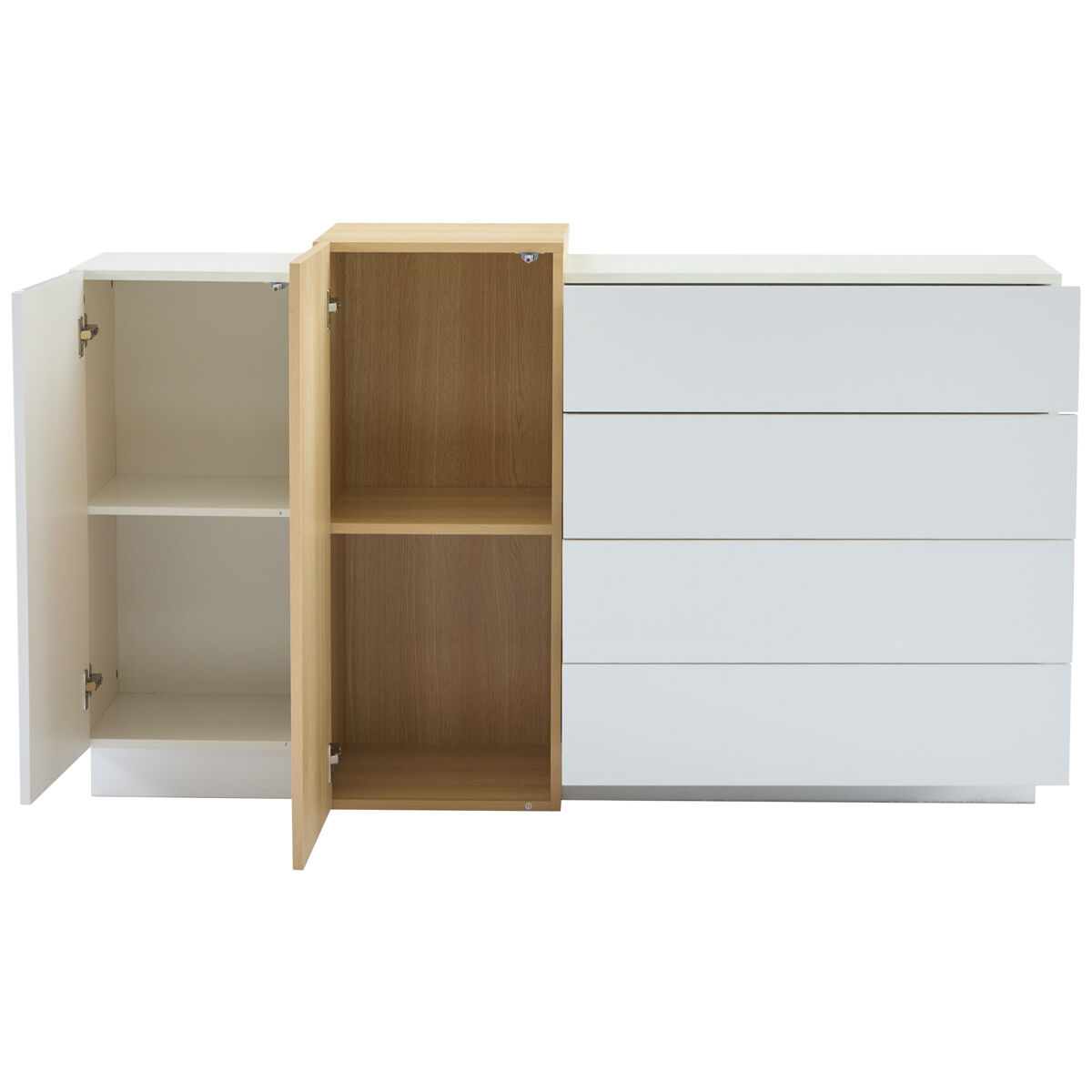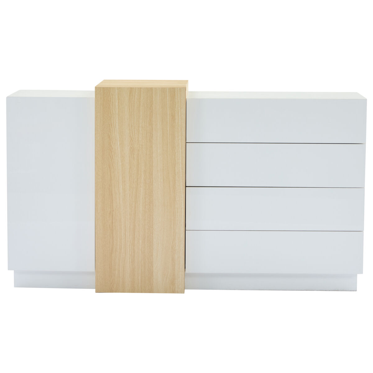 Com 4 gavetas amplas escalonadas e 2 armários com portas, este móvel organiza perfeitamente tudo, desde roupa de inverno até objetos do quotidiano. Além disso, a superfície suporta até 30 kg, permitindo colocar plantas ou dispositivos eletrónicos. A elegante faixa decorativa de madeira estende-se horizontalmente ao longo do móvel, proporcionando um contraste de materiais que mantém o calor natural do ambiente, enquanto a superfície de alto brilho reflete a luz, ampliando visualmente o espaço.