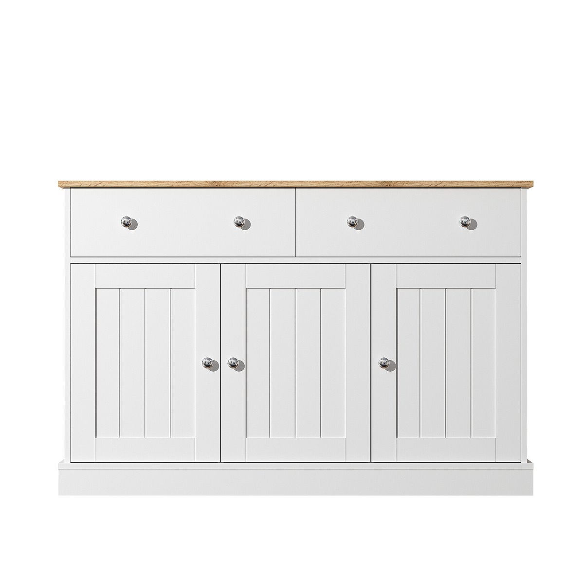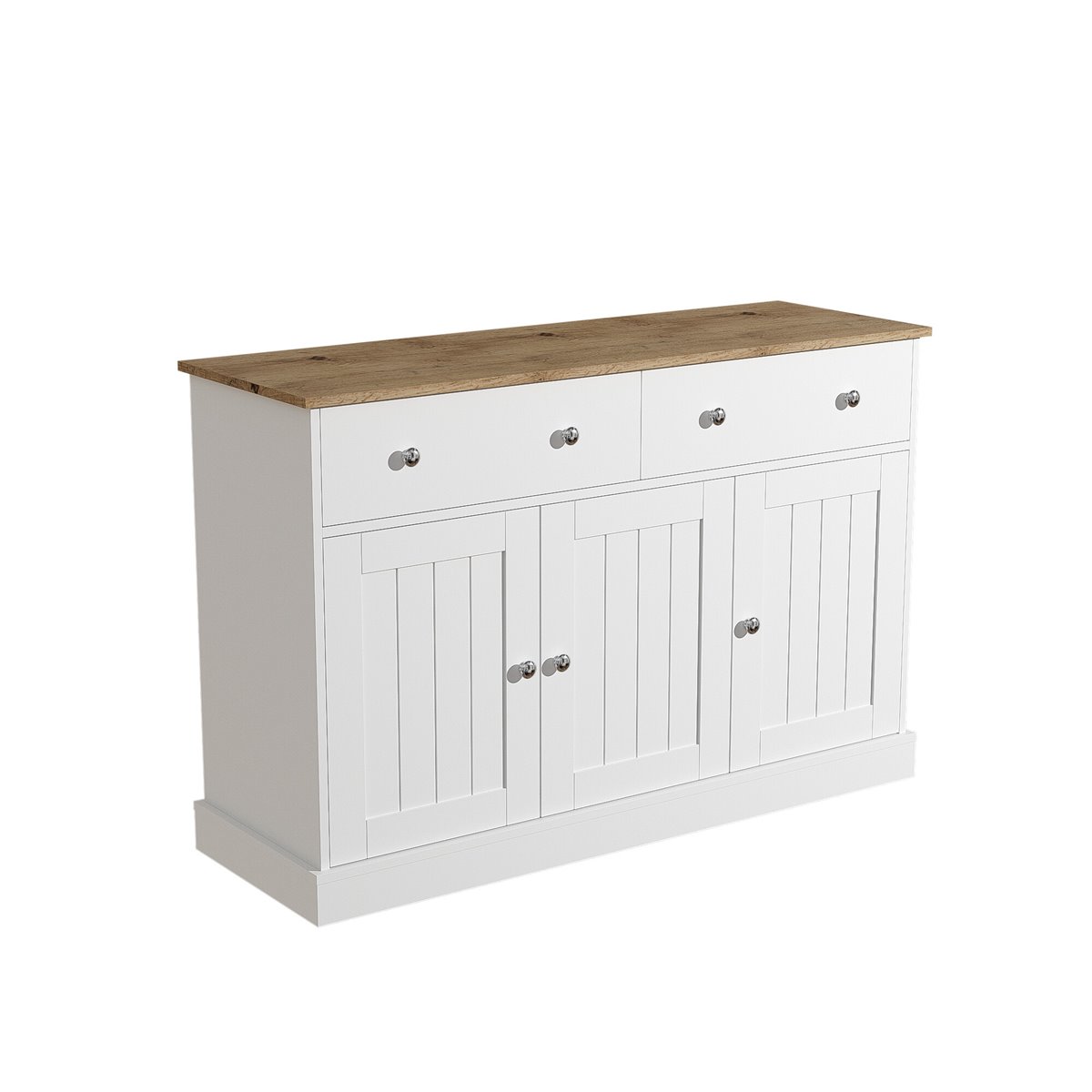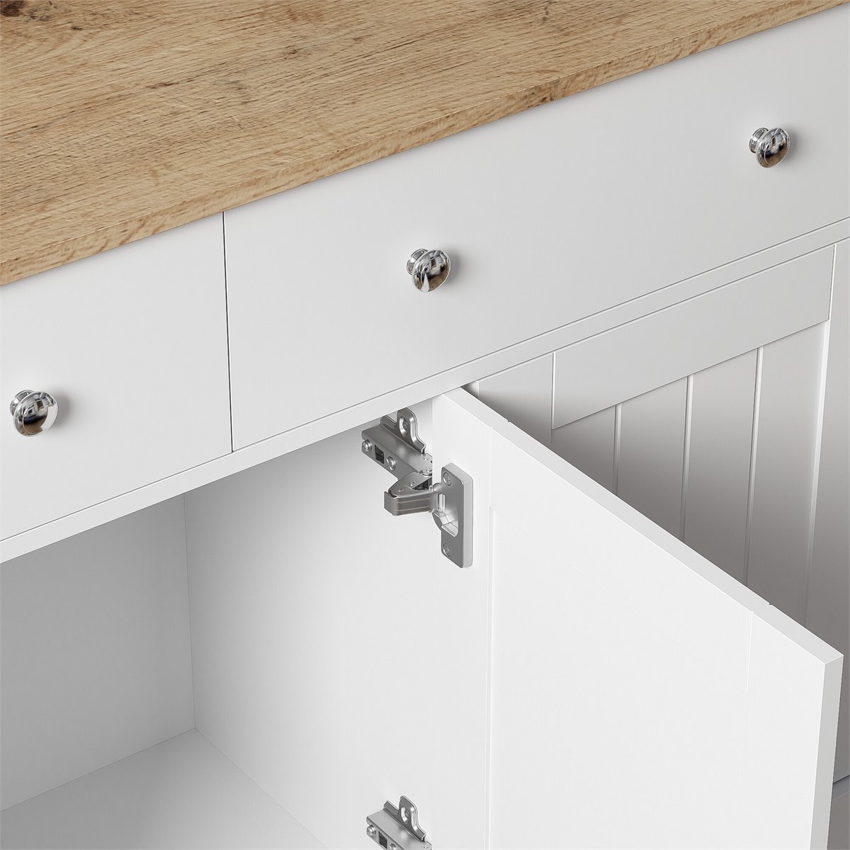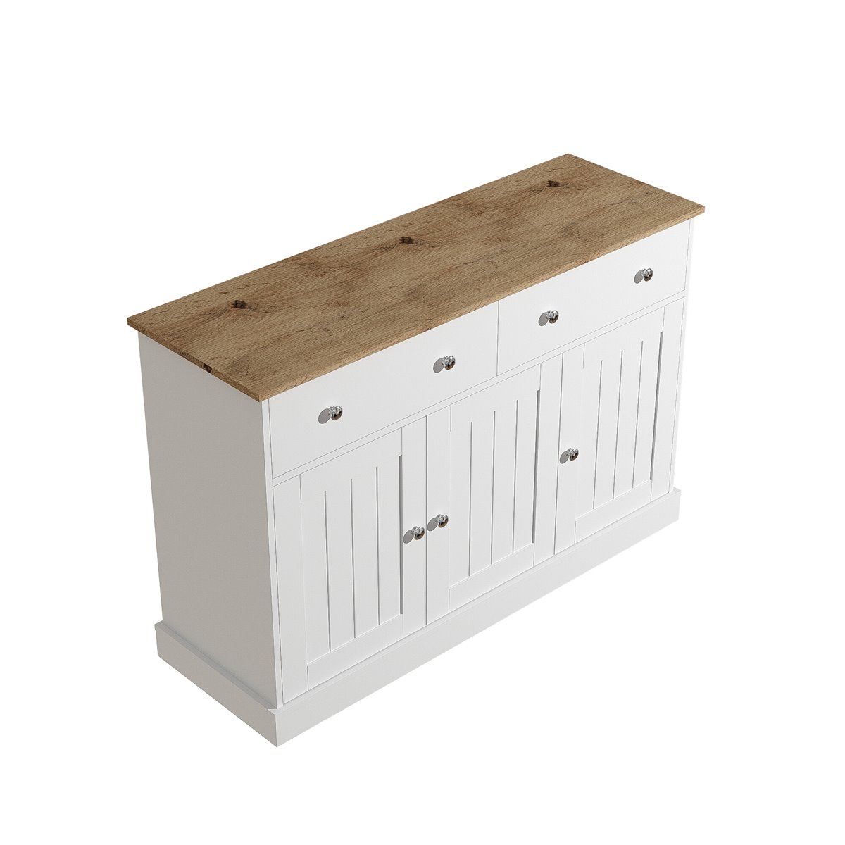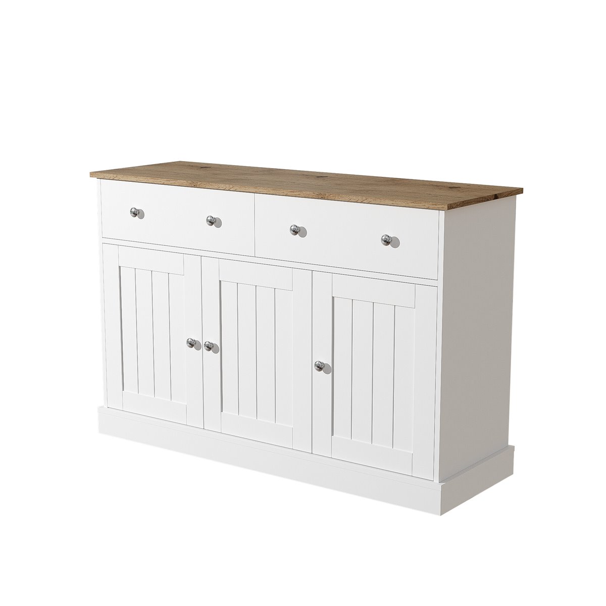 - Design elegante: O aparador combina tons de madeira com um acabamento branco brilhante, criando um estilo sofisticado que se adapta a diferentes tipos de decoração.