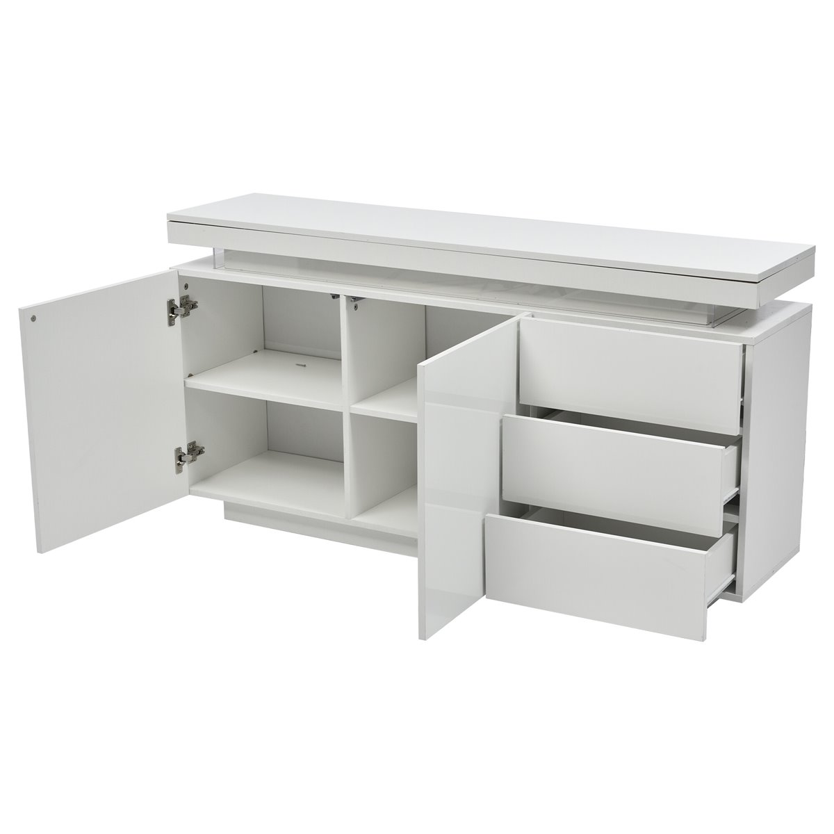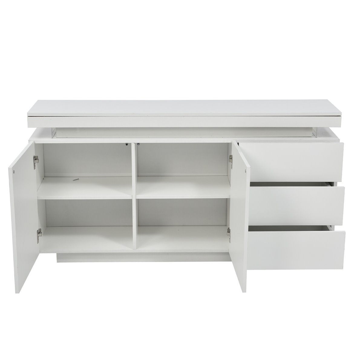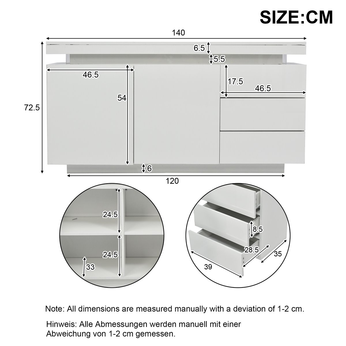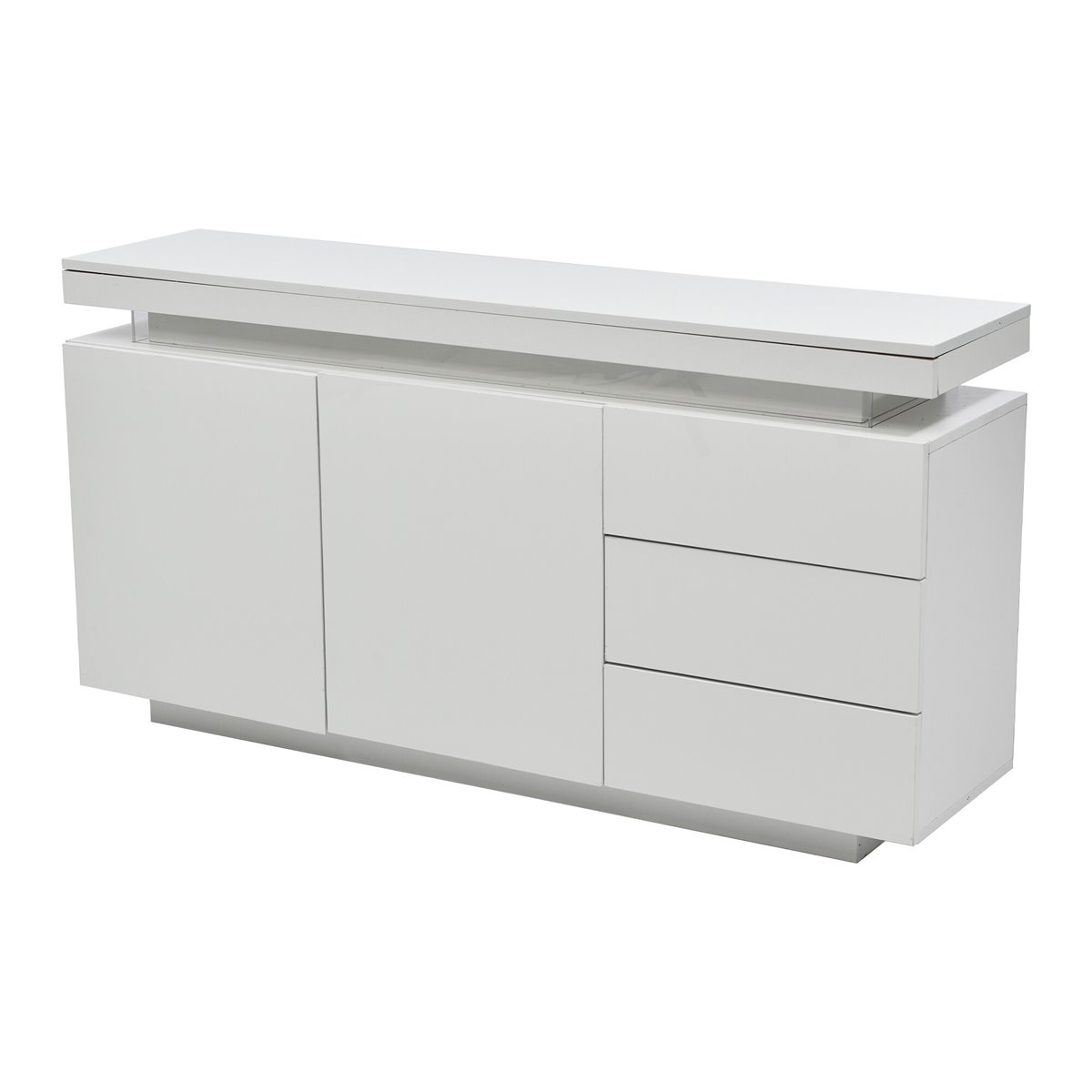 O aparador tem 2 portas e 3 gavetas sem puxadores, o que garante uma utilização confortável e simples. O seu amplo espaço de arrumação é ideal para livros, documentos e outros objetos pessoais. Além disso, o seu sistema de iluminação LED pode ser facilmente controlado a partir de uma aplicação móvel, permitindo-lhe personalizar a luz com mais de 60 000 cores e diferentes modos para criar a atmosfera perfeita em qualquer ocasião.